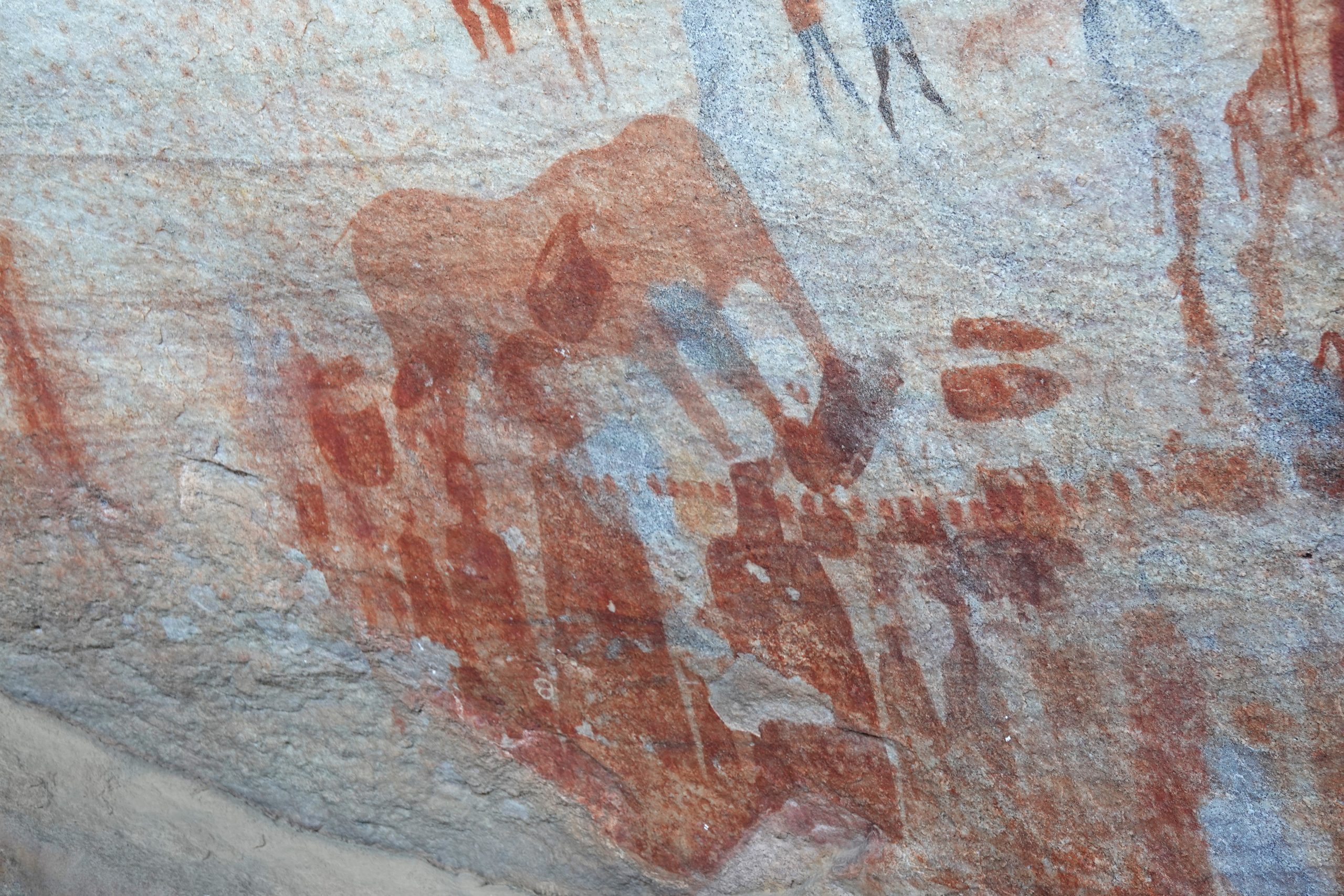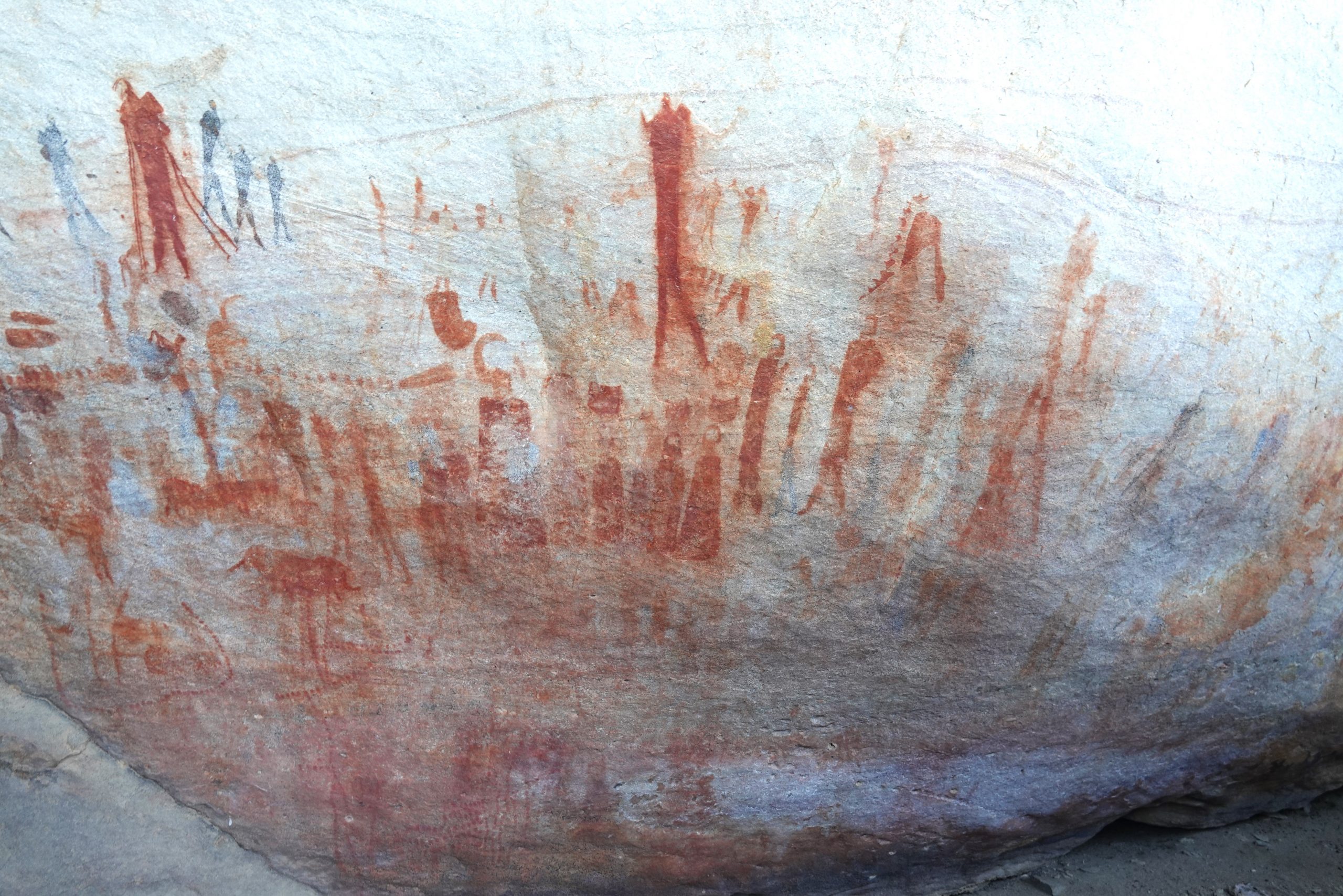 The Fallen Rock shelter is named for the fallen slab of rock at one end of the cave. The art at the site depicts various shaman rituals. The central figure in the cave Is a classic representation of a trance state. Another notable painting at the site is a strange grouping – an older elephant picture and a more recent (6,000 years old) depiction of a camp of San in a cave. We explored the cave and nearby rocks for some 2 hours.