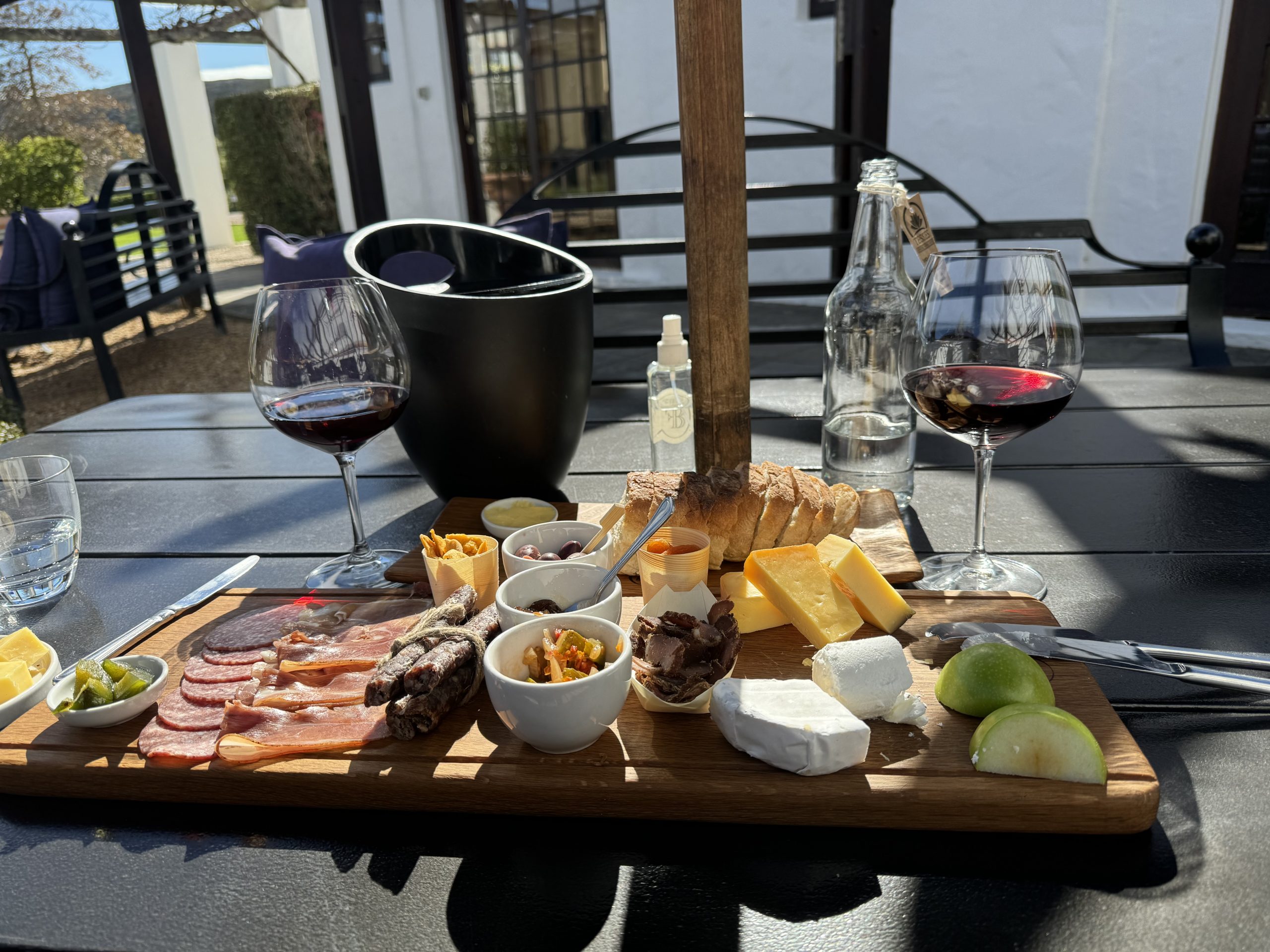 Next in the Hemel-en-Aarde valley is Bouchard Finlayson, one of the wineries we’ve been most exited to visit. They specialize in award-winning Pinot Noir, Sauvignon Blanc and Chardonnay. We enjoyed our tasting outside in the courtyard and ordered a Charcuterie platter for two as accompaniment. OK, maybe two families with teenage sons. Holy cow! We ate what we could and divided the remainder so we could share it with John and take some home. Great wine, great food, awesome location.