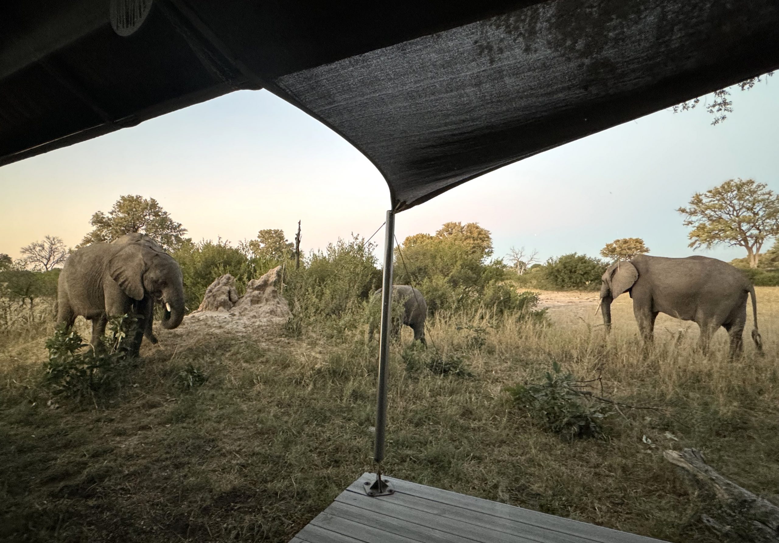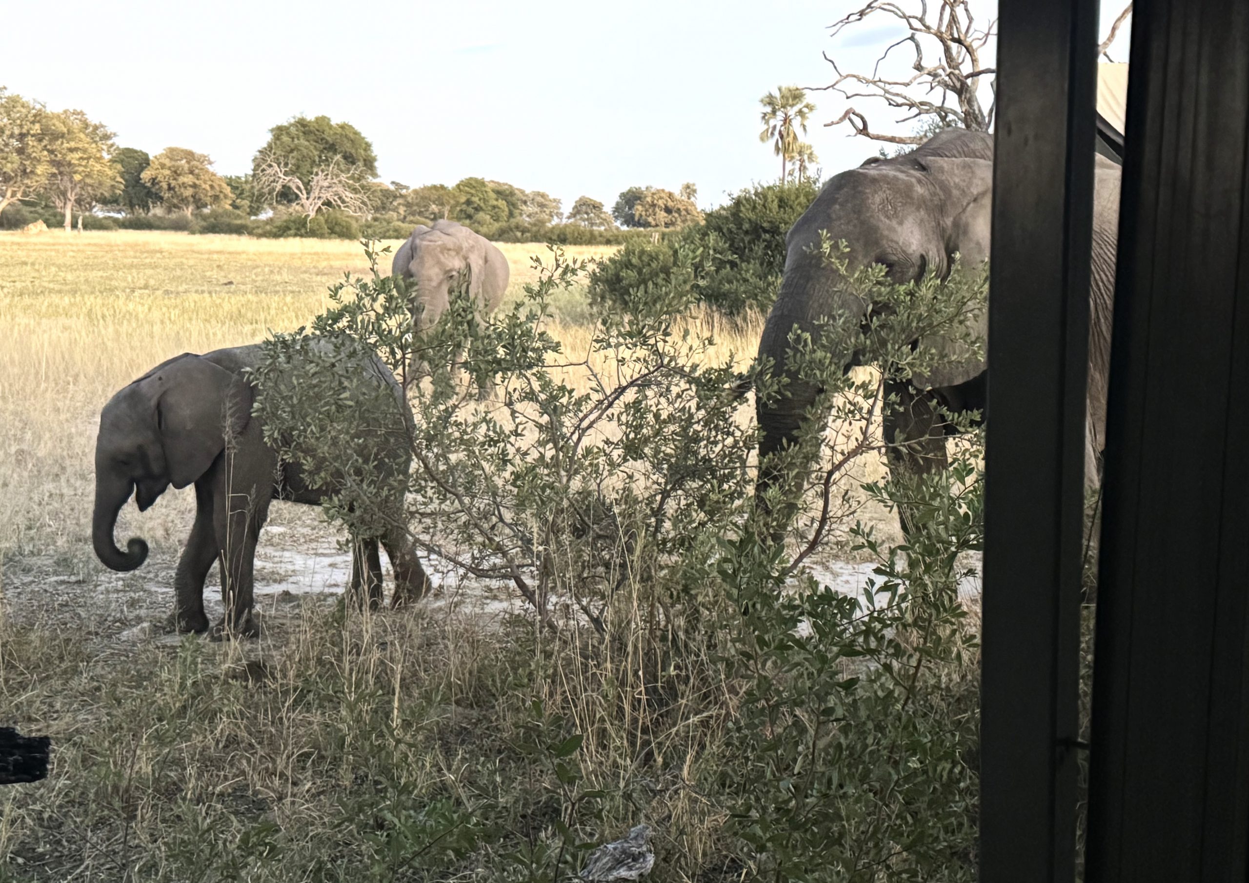 Wow – what a way to start the day! After packing up our gear and getting ready for breakfast we realized there was a bunch of elephants surrounding our cabin – at least 20 and quite a few mothers with babies. We weren’t going anywhere for a while, but it made for great theater!