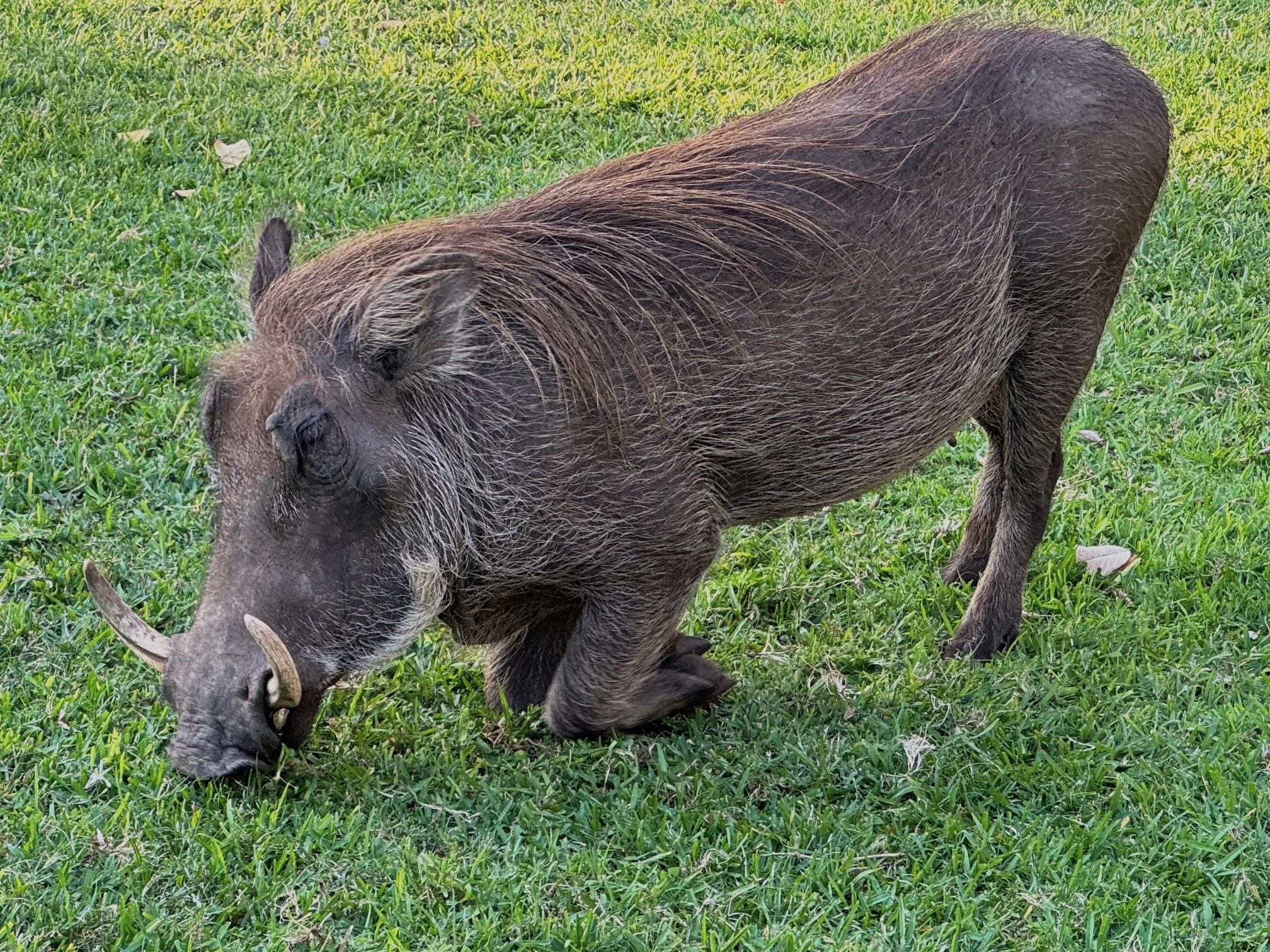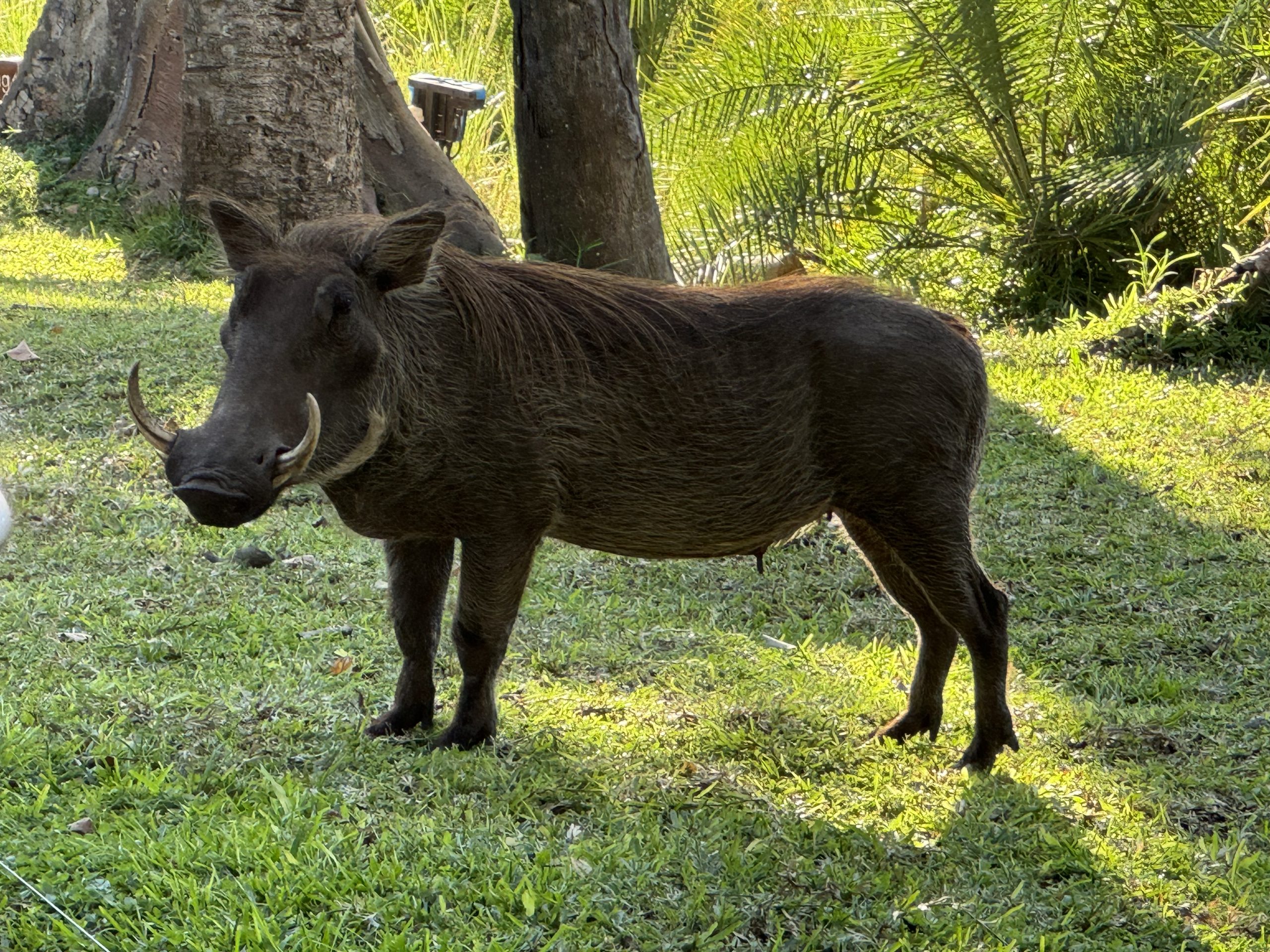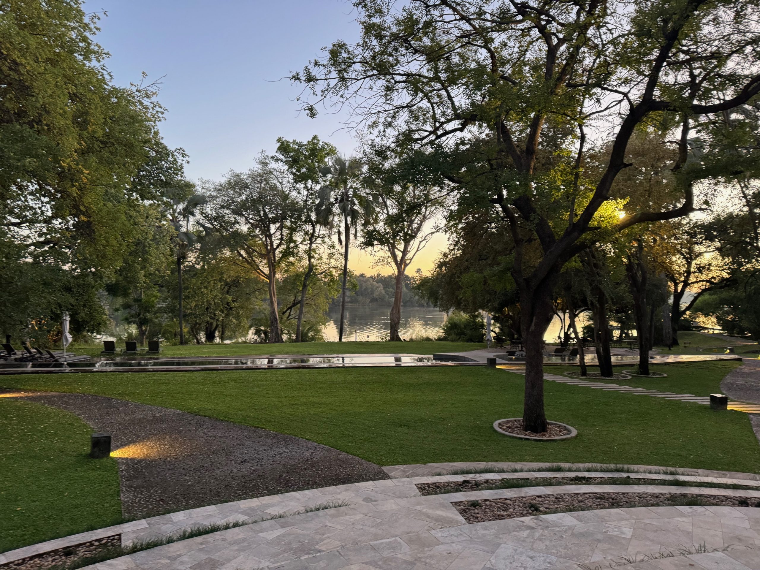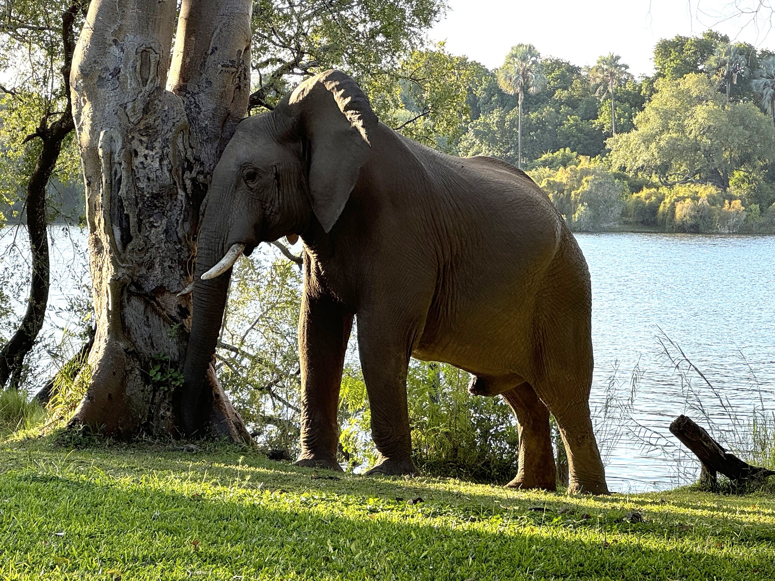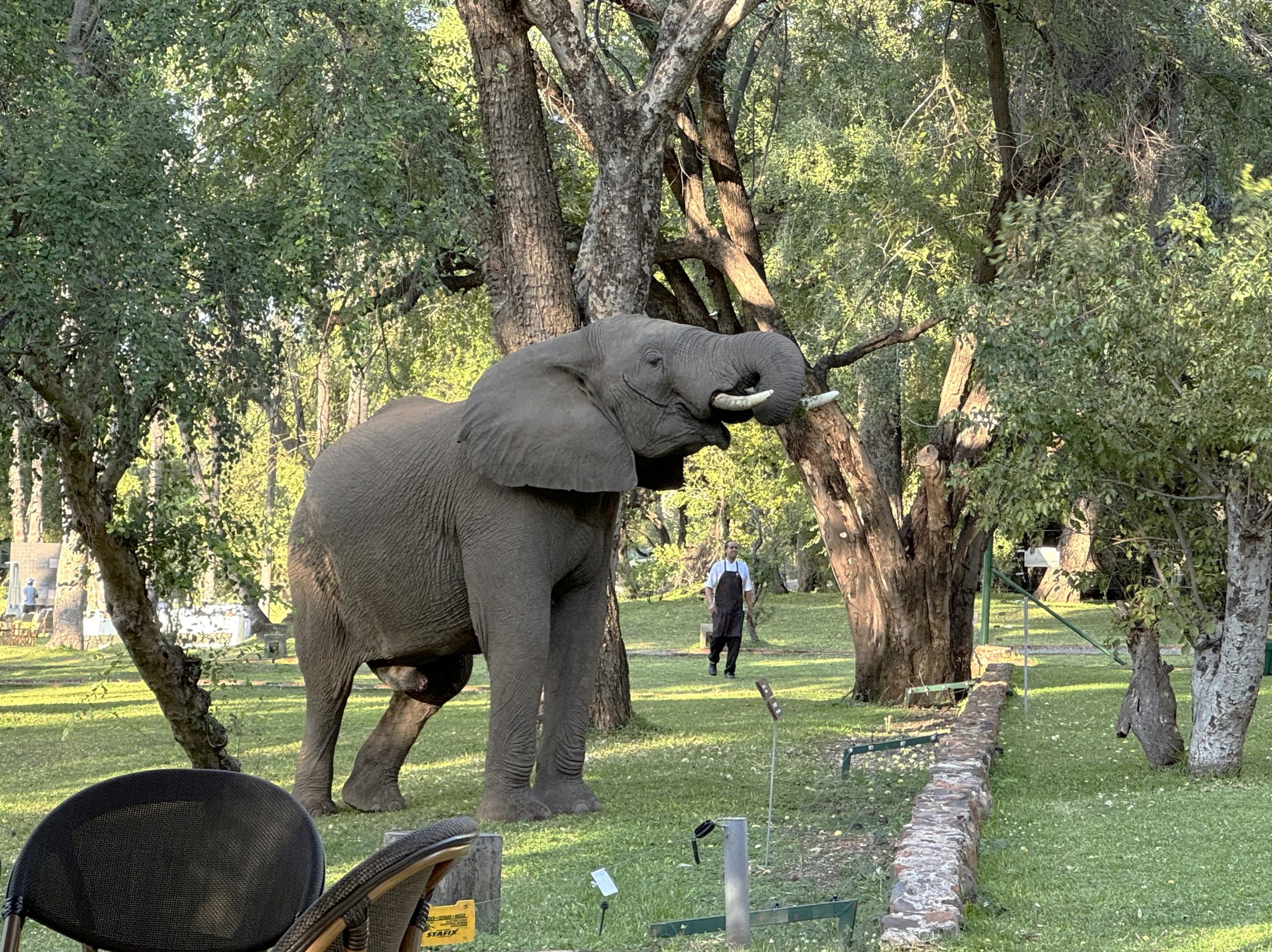 Back at the Palm we found some seats on the lawn overlooking the Zambezi River. Wildlife everywhere with Warthogs & Elephants wandering the grounds. They seemed pretty oblivious to humans. Warthogs actually kneel on their front knees to feed because the have short necks and relatively long legs. They’ve adapted by developing special kneepads. Strange stuff!