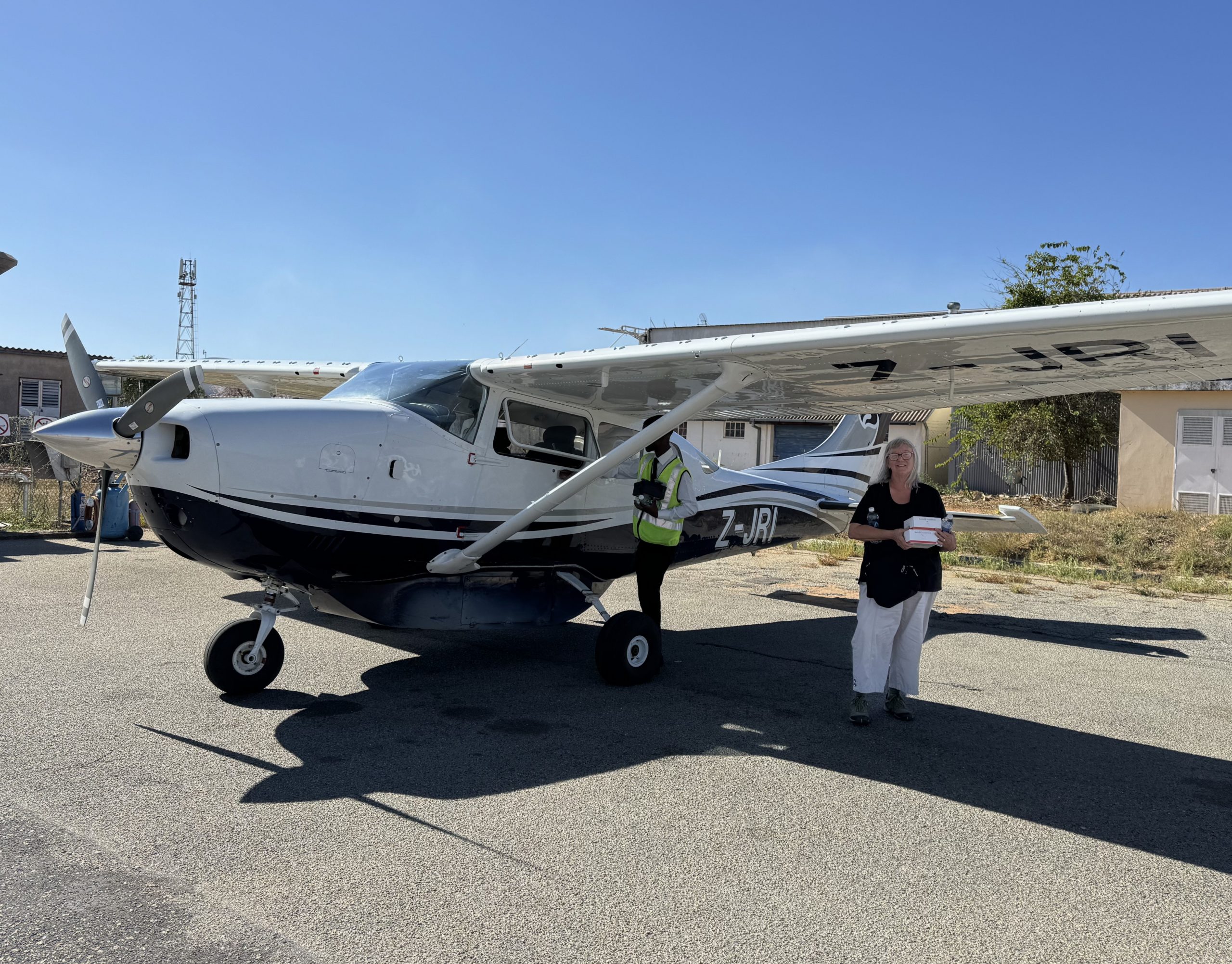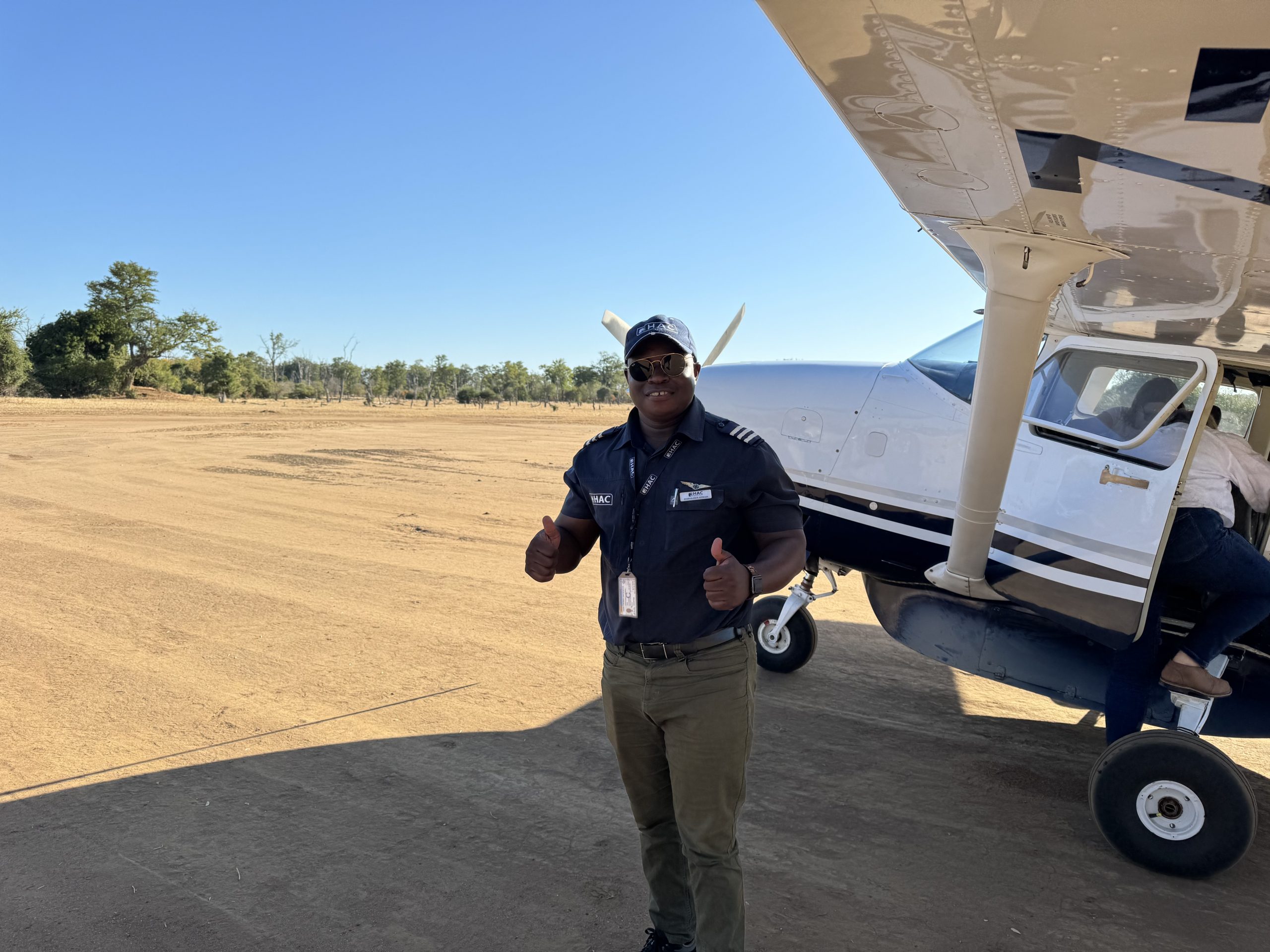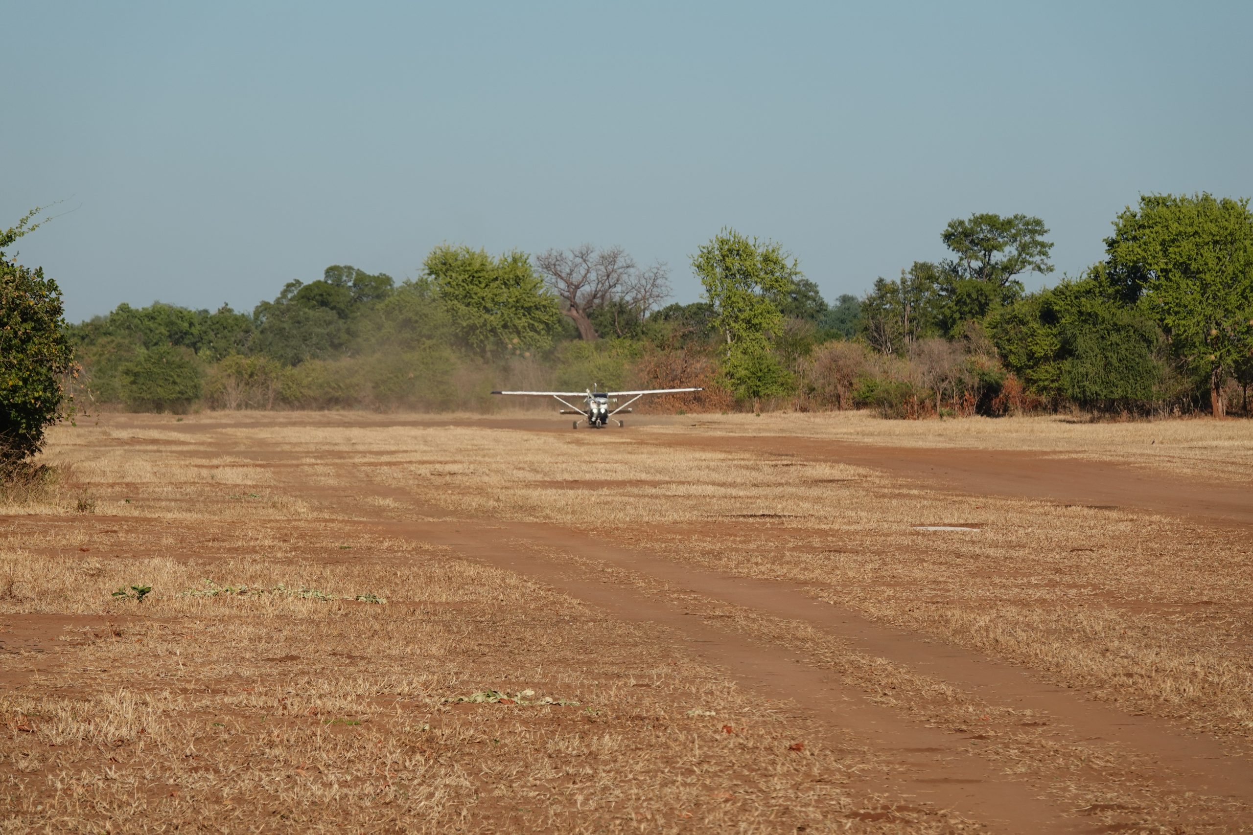 There are four of us on the bush plane flight to the Mana Pools airstrip. Our travelling companions were travel agents on a recon trip. We’re headed to ‘Kanga Camp’, they are going to another camp in the park. This is a very small plane owned by ‘Safari Logistics’. There’s a pilot, four passengers and luggage. One woman sat in the co-pilots seat. Dick sat in the very rear with excess luggage. The luggage restrictions for bush flights require soft-sided bags with a 33 lb max. It makes sense after seeing how the luggage is packed into the small storage area.