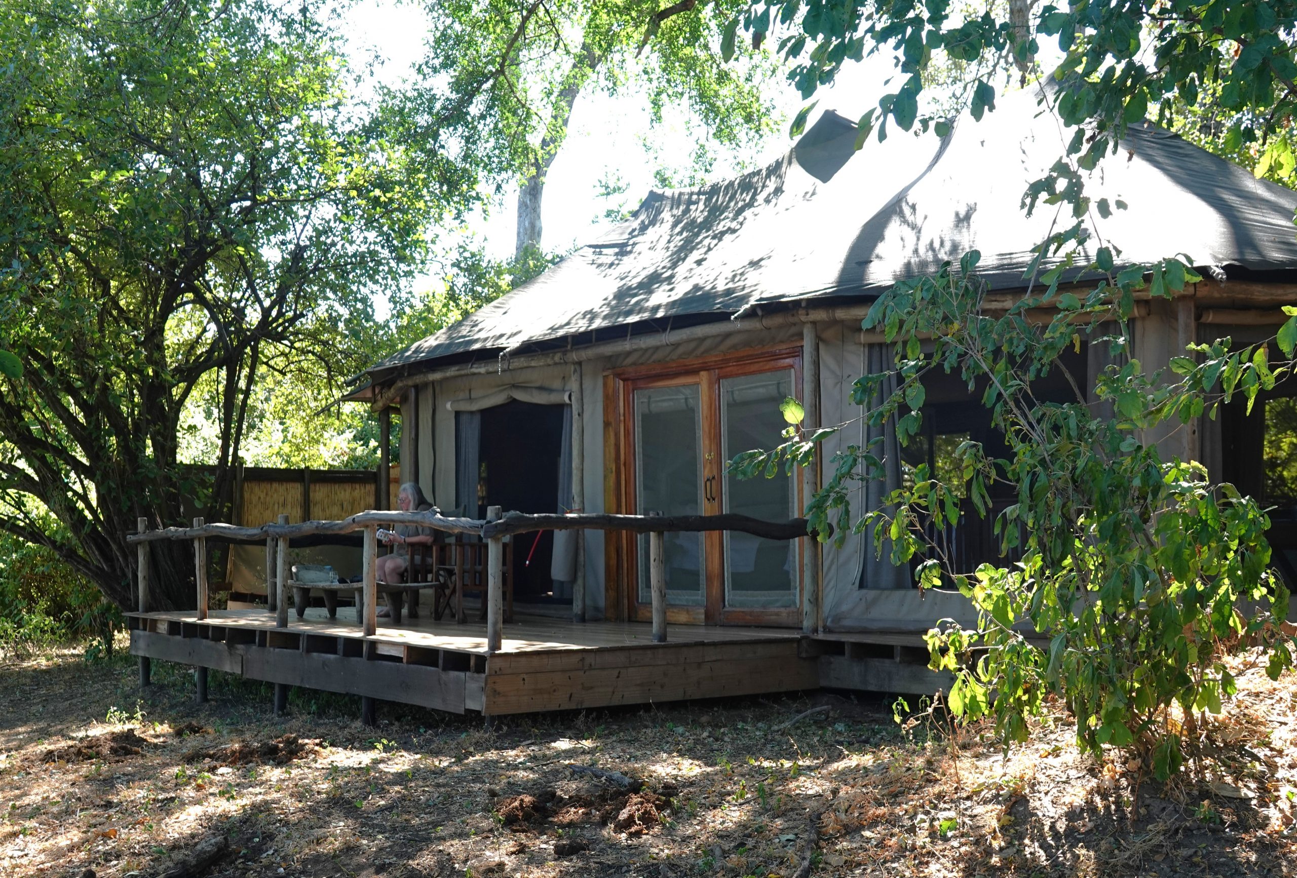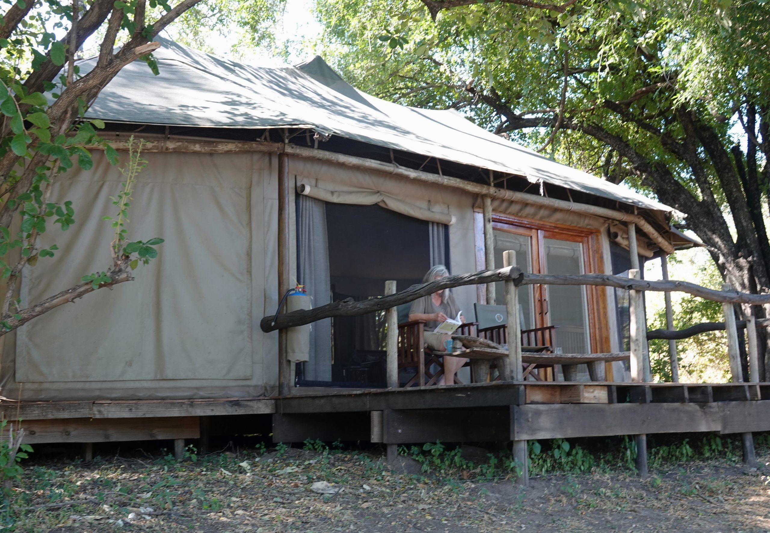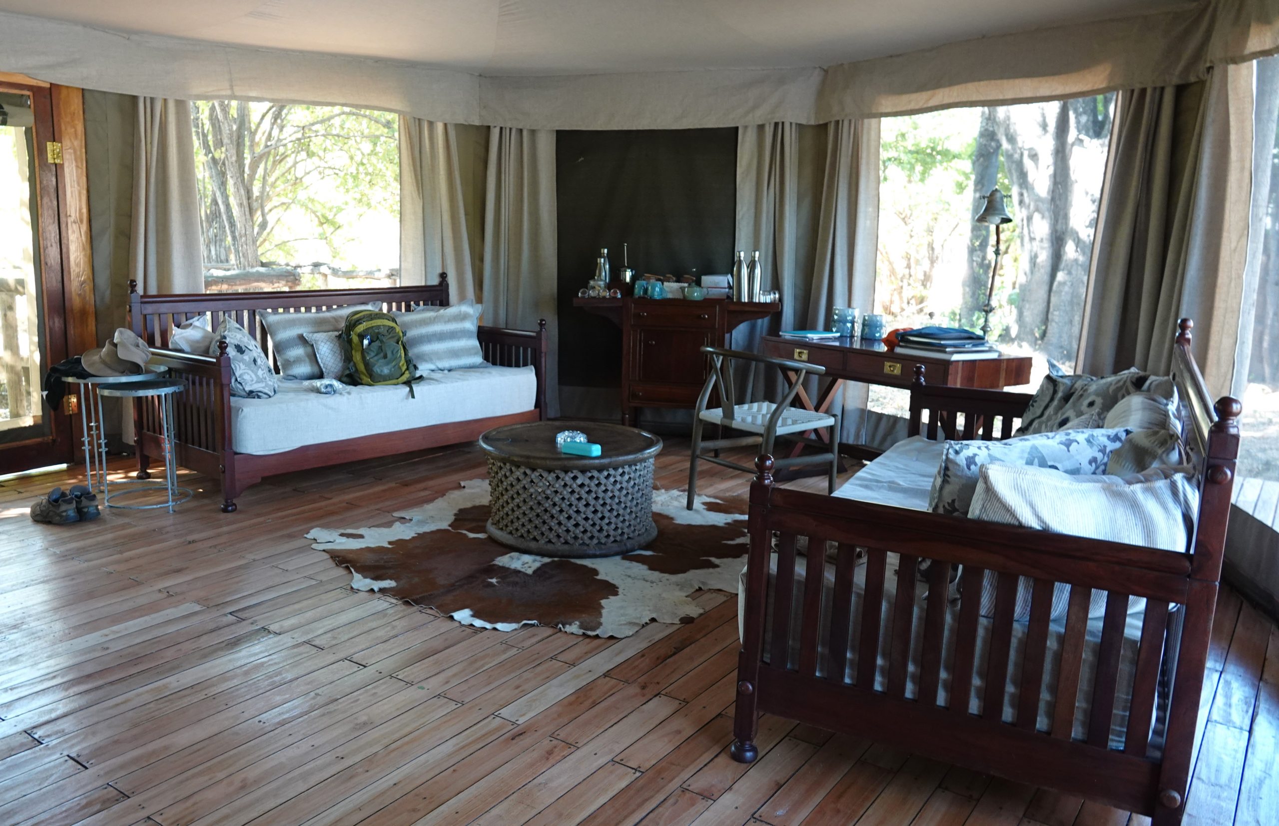 It’s a 1.5 hour flight from Harare to the Mana Pools strip. On arrival, the safari drivers are waiting for us. ‘Reggie’ from Kanga Camp has picked us up. He’ll be our guide for our time here. It’s a short drive through the bush to the camp where we are greeted by the whole staff with a traditional indigenous welcome, quite moving. Our host is ‘Joyce’ and our personal butler is ‘Tenbayti’. This is the most rustic of the camps we will stay at but it’s pretty nice. There are six tented cabins and a common dining area with bar centered around a water hole. We’re in luck as we are assigned the ‘honeymoon suite’. It’s a large, tented suite with king sized bed, a generous sitting area, deck, mosquito netting, indoor toilet and outdoor shower & toilet. We share the outdoor toilet with tree frogs.