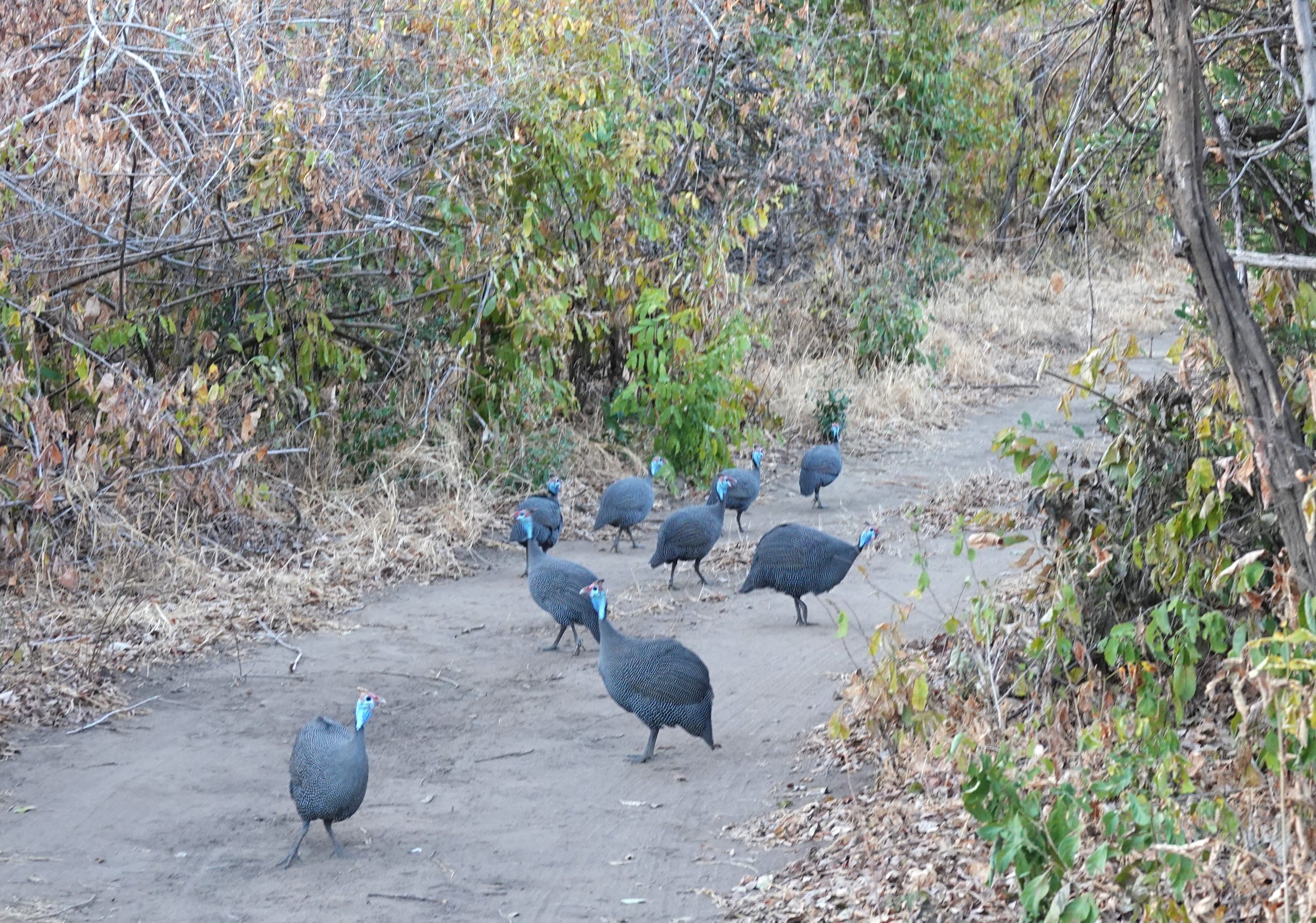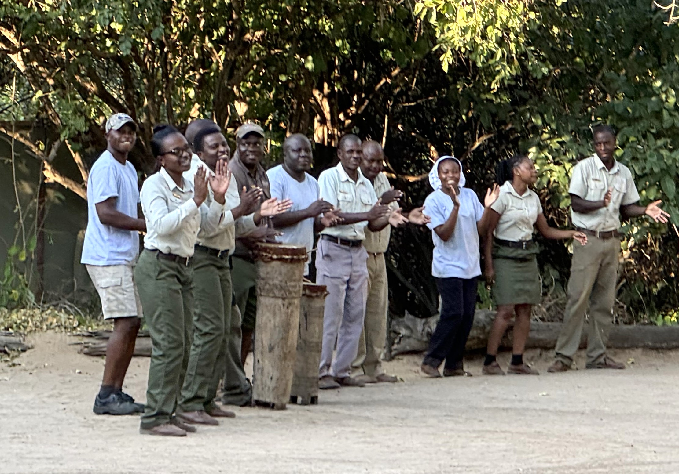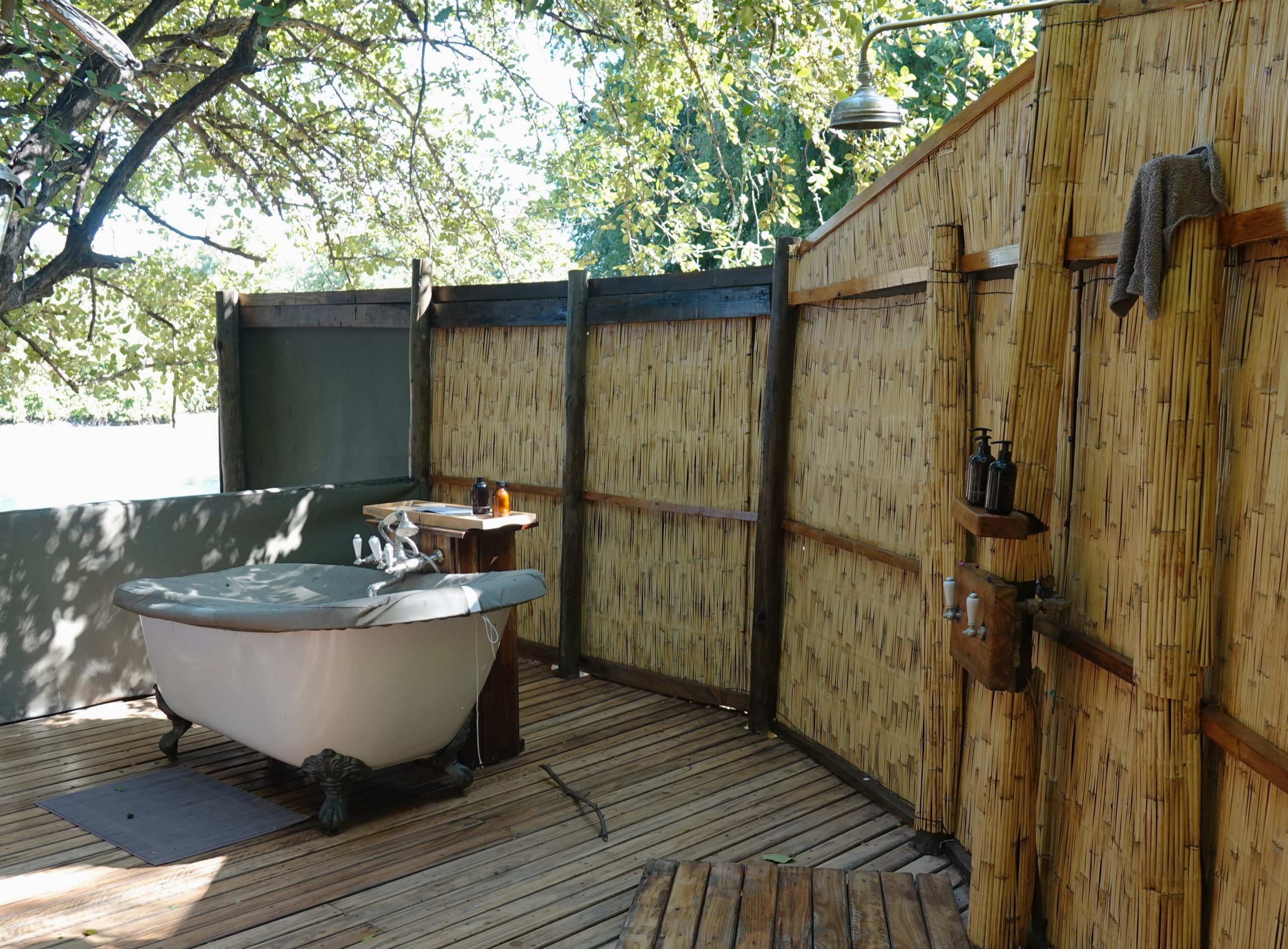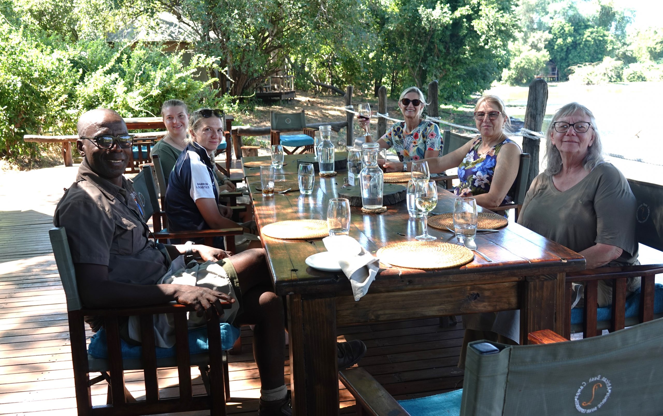 It’s a 1.5 hour flight from Harare to the Mana Pools strip. On arrival, the safari drivers are waiting for us. ‘Reggie’ from Kanga Camp has picked us up. He’ll be our guide for our time here. It’s a short drive through the bush to the camp where we are greeted by the whole staff with a traditional indigenous welcome, quite moving. Our host is ‘Joyce’ and our personal butler is ‘Tenbayti’. This is the most rustic of the camps we will stay at but it’s pretty nice. There are six tented cabins and a common dining area with bar centered around a water hole. We’re in luck as we are assigned the ‘honeymoon suite’. It’s a large, tented suite with king sized bed, a generous sitting area, deck, mosquito netting, indoor toilet and outdoor shower & toilet. We share the outdoor toilet with tree frogs.