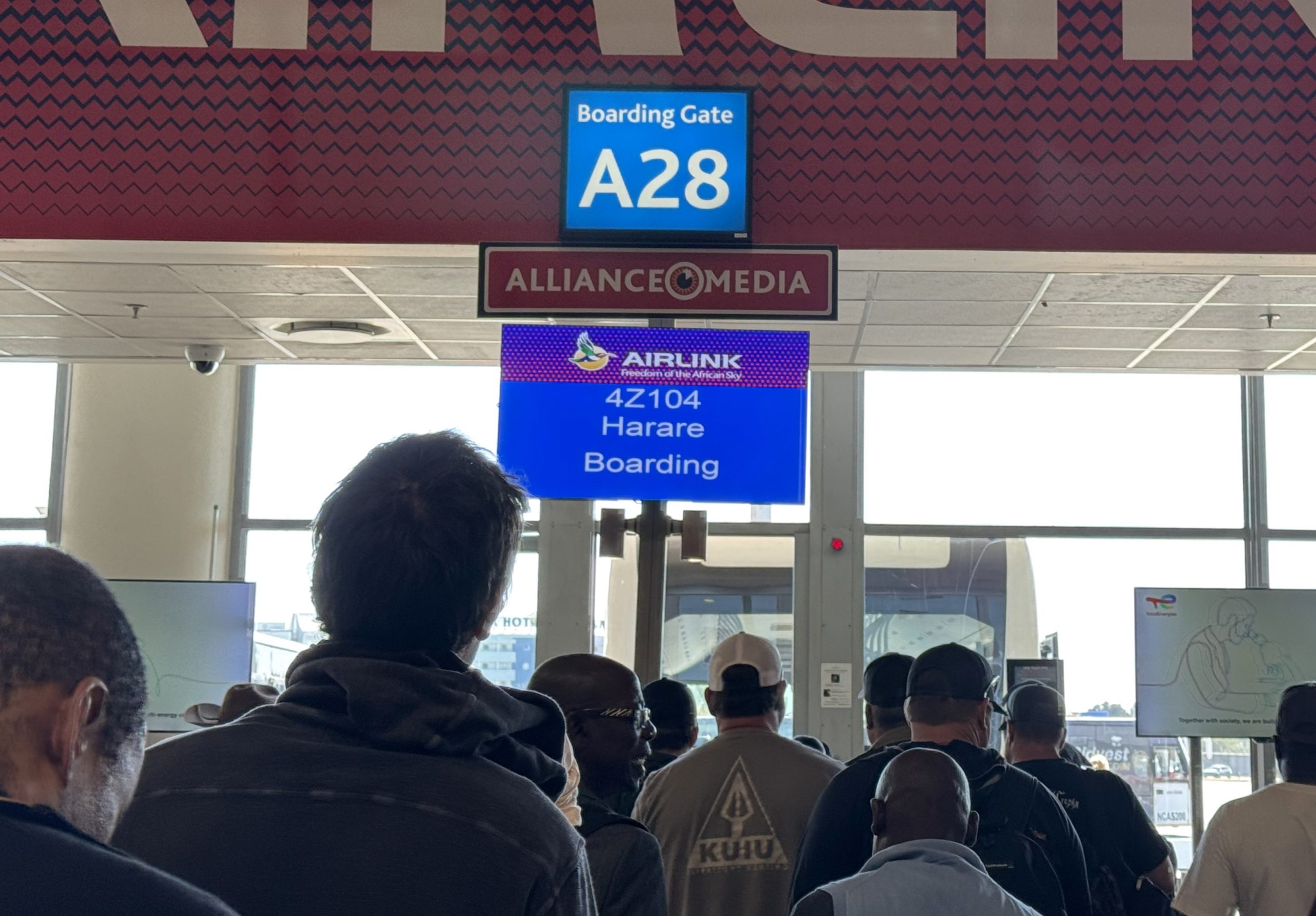 We are leaving civilization as we know it behind. We’re up at 3 AM for a 4:00 pickup by our driver, Arthur. It’s an hour & a half drive from Hermanus to Cape Town Airport. We’ve got three flights today to get to Kanga Camp in Mana Pools National Park. The first leg of the trip is a 6:50 flight from Cape Town to O.R.Tambo International Airport in Johannesburg. Our carrier is ‘Airlink’, South Africa’s primary airline. On arrival in Johannesburg, we had to process through immigration as we are leaving South Africa. The lines were huge and slow. After clearing immigration it’s a real hike to our departure gate.