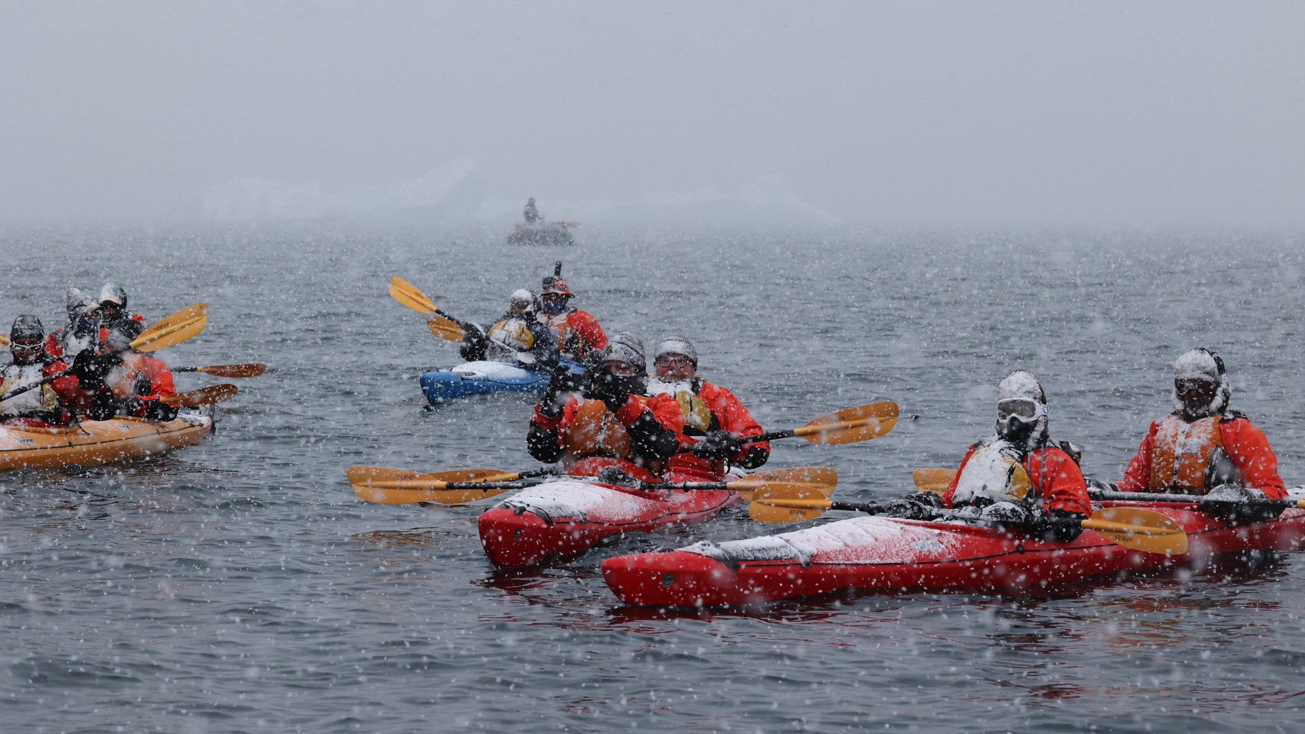 The same heavy snow that caught Mary’s zodiac nailed the kayakers. FINALLY – some real Antarctic weather. Blizzard-like conditions. Zero visibility. Couldn’t see the ship or shore. It finally eased up enough so the kayaks could get unloaded. Totally awesome.