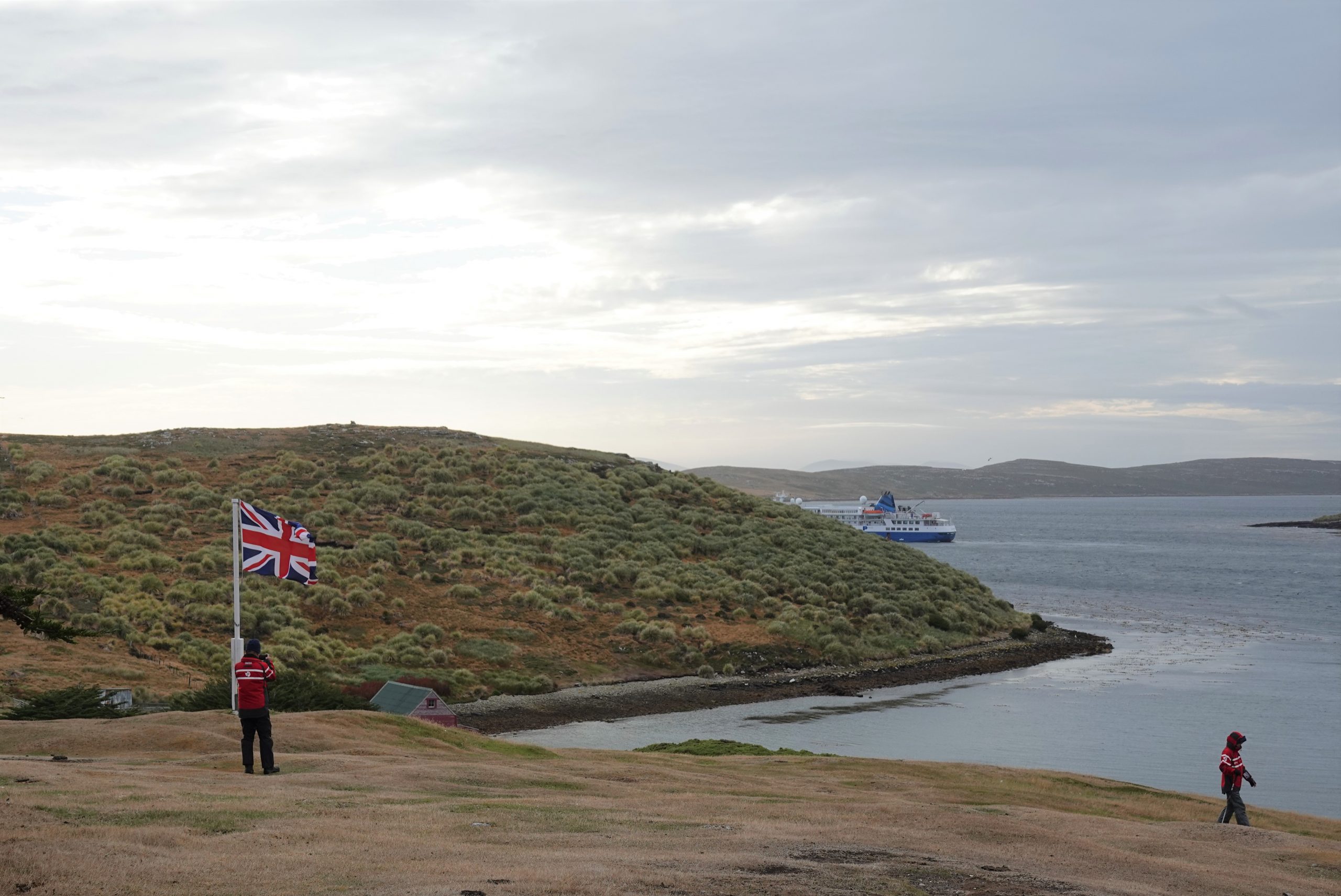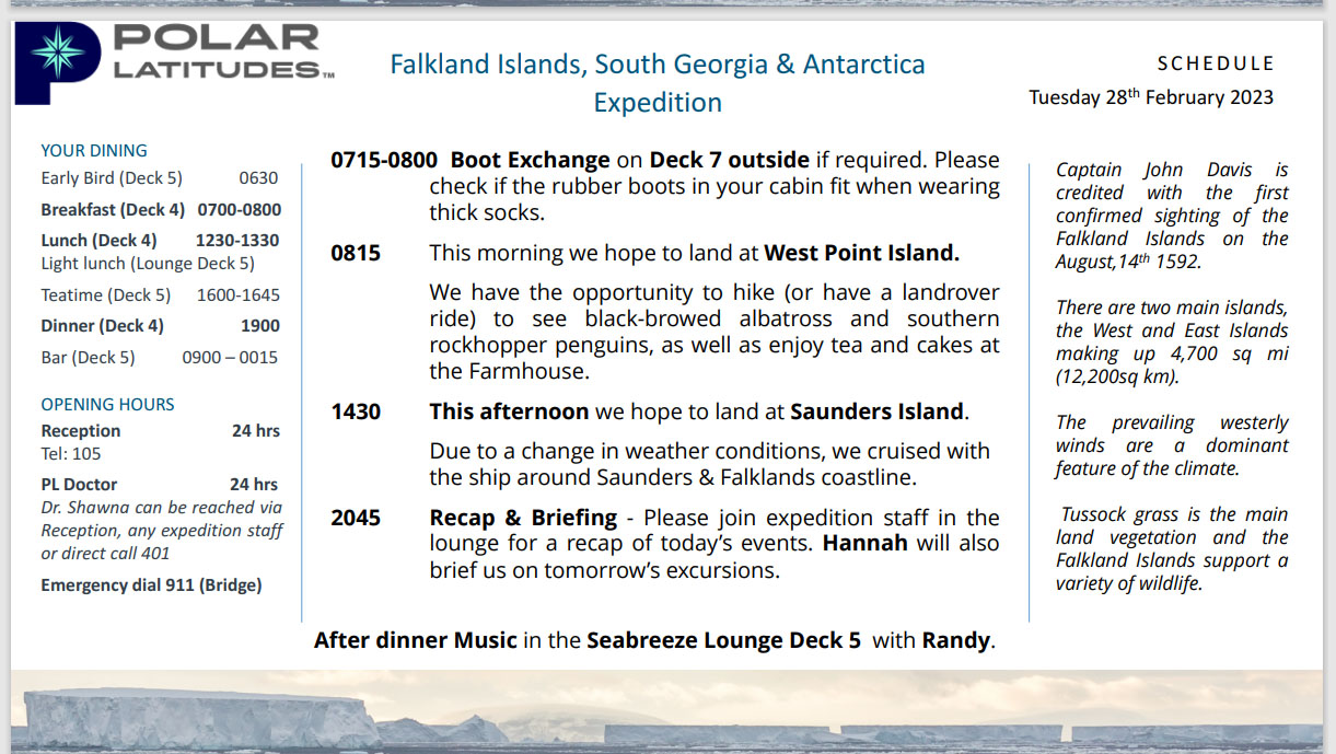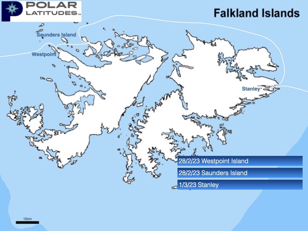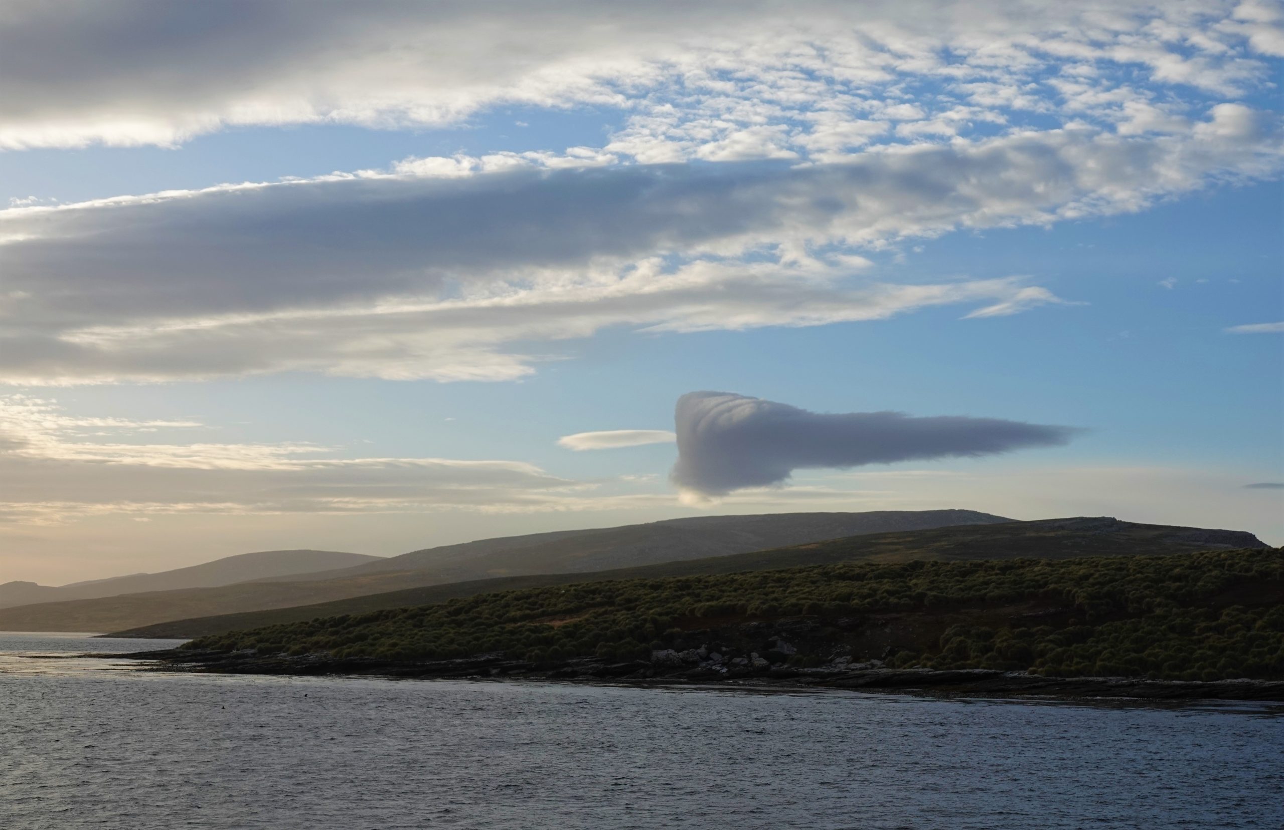 It was a beautiful morning and Dick was able to get some nice pics of the sunrise as we neared the West Falkland/Malvinas Island chain. The islands are formally governed by the English (and known by them as the Falklands) but also claimed by Argentina (called the Malvinas by them). In actuality, the islands are self-governed with locally elected representatives.