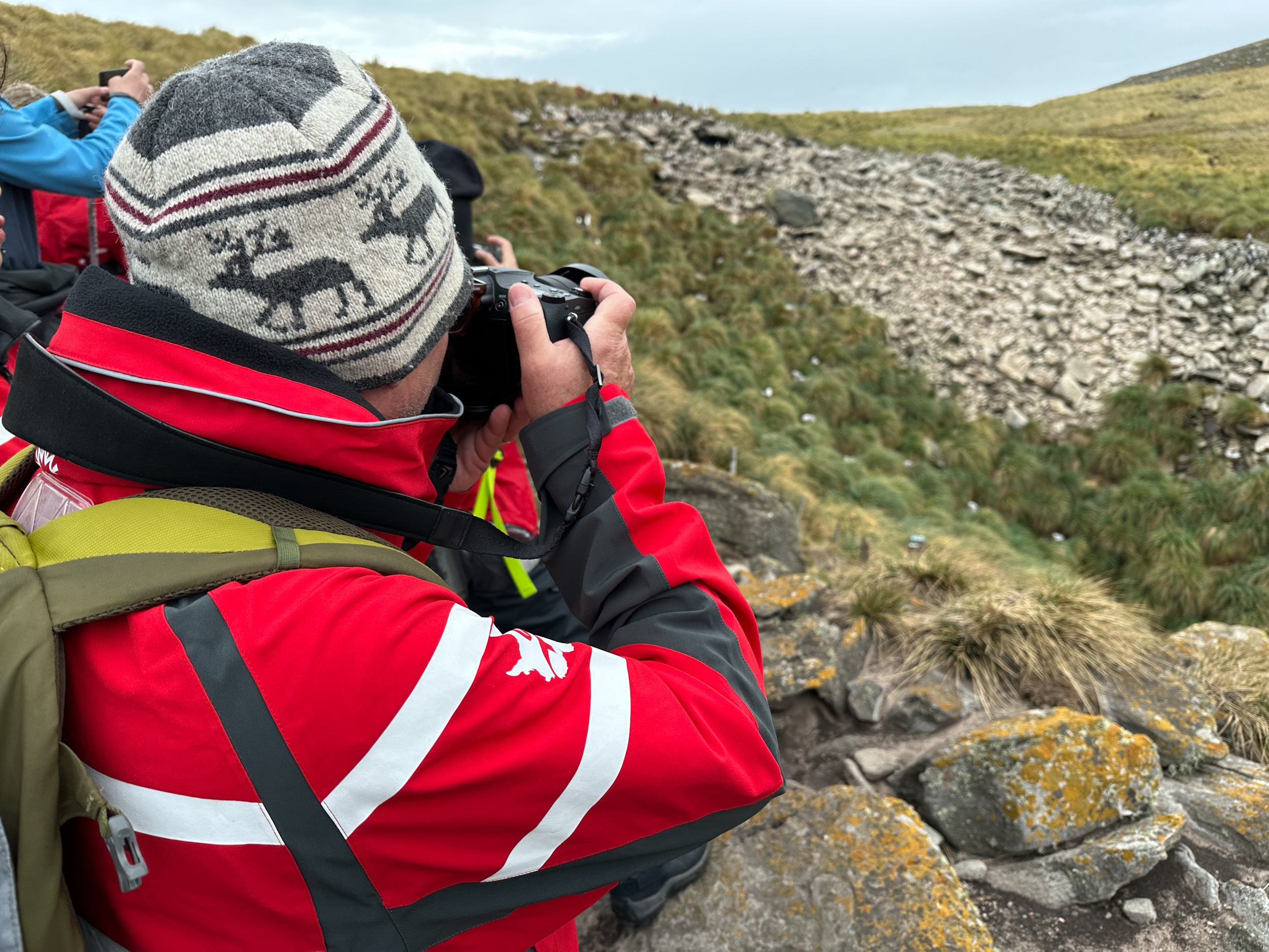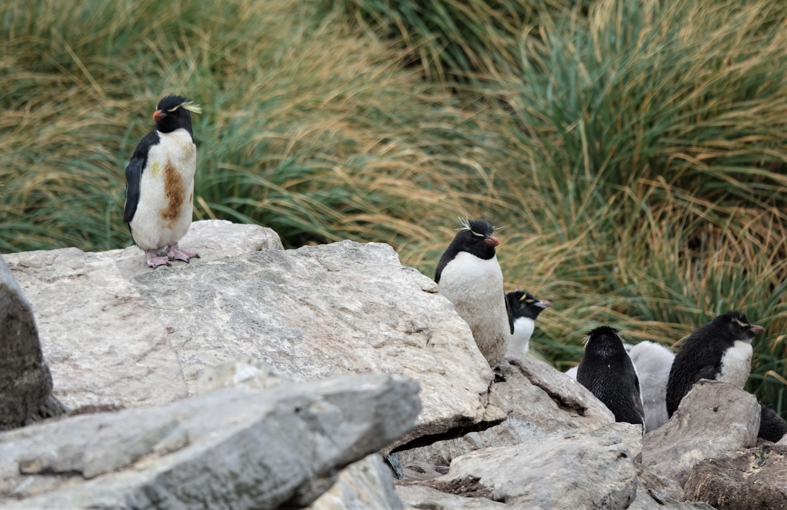 Mixed in with the albatross nests is a colony of Rockhopper Penguins. They sometimes dig burrows in the Tussock grass. They are hilarious to watch as they hop up the steep slopes of the landscape – it is obvious how they got their name. They are in the ‘crested penguin’ family and are the smallest of the subantarctic penguins. They spend their winters at sea, sometimes for up to six months without coming to shore.