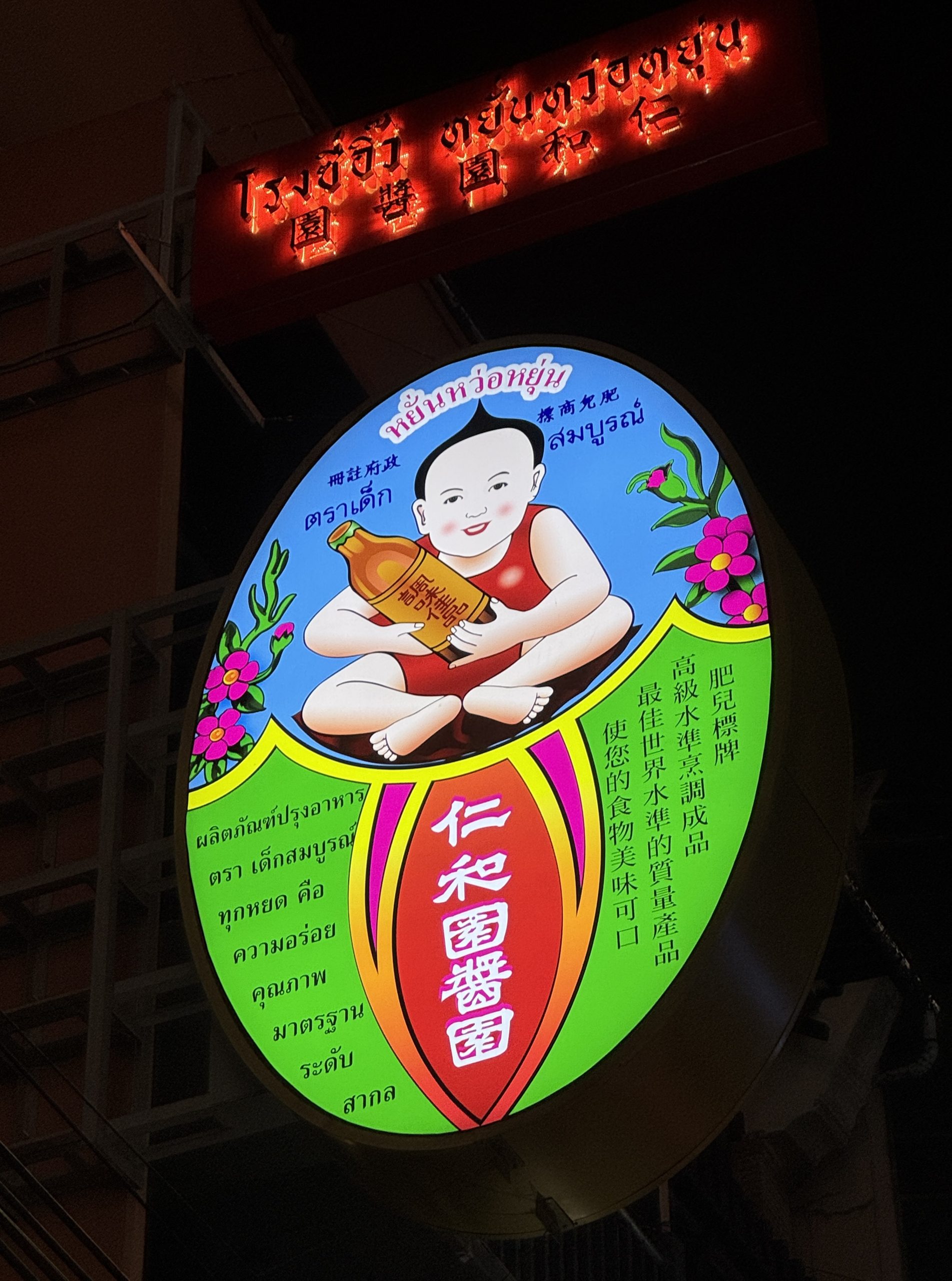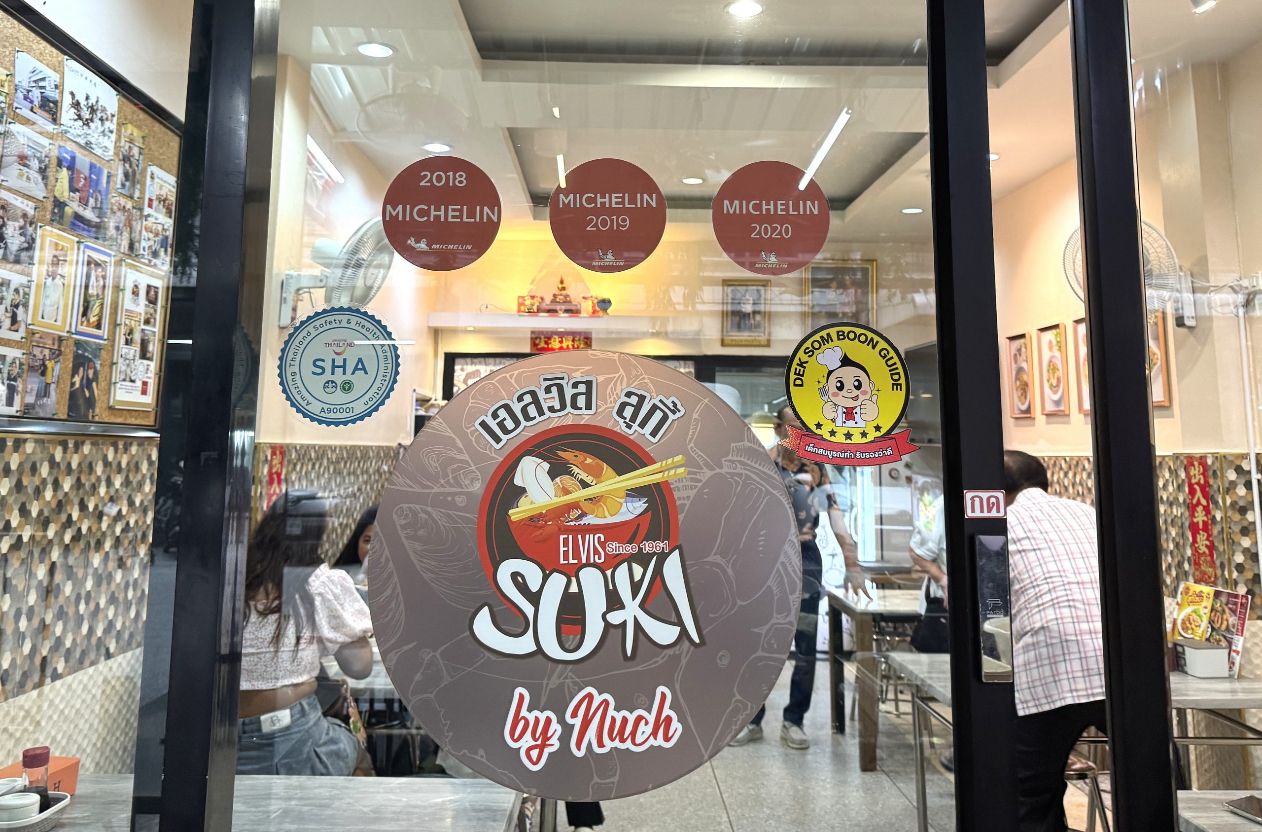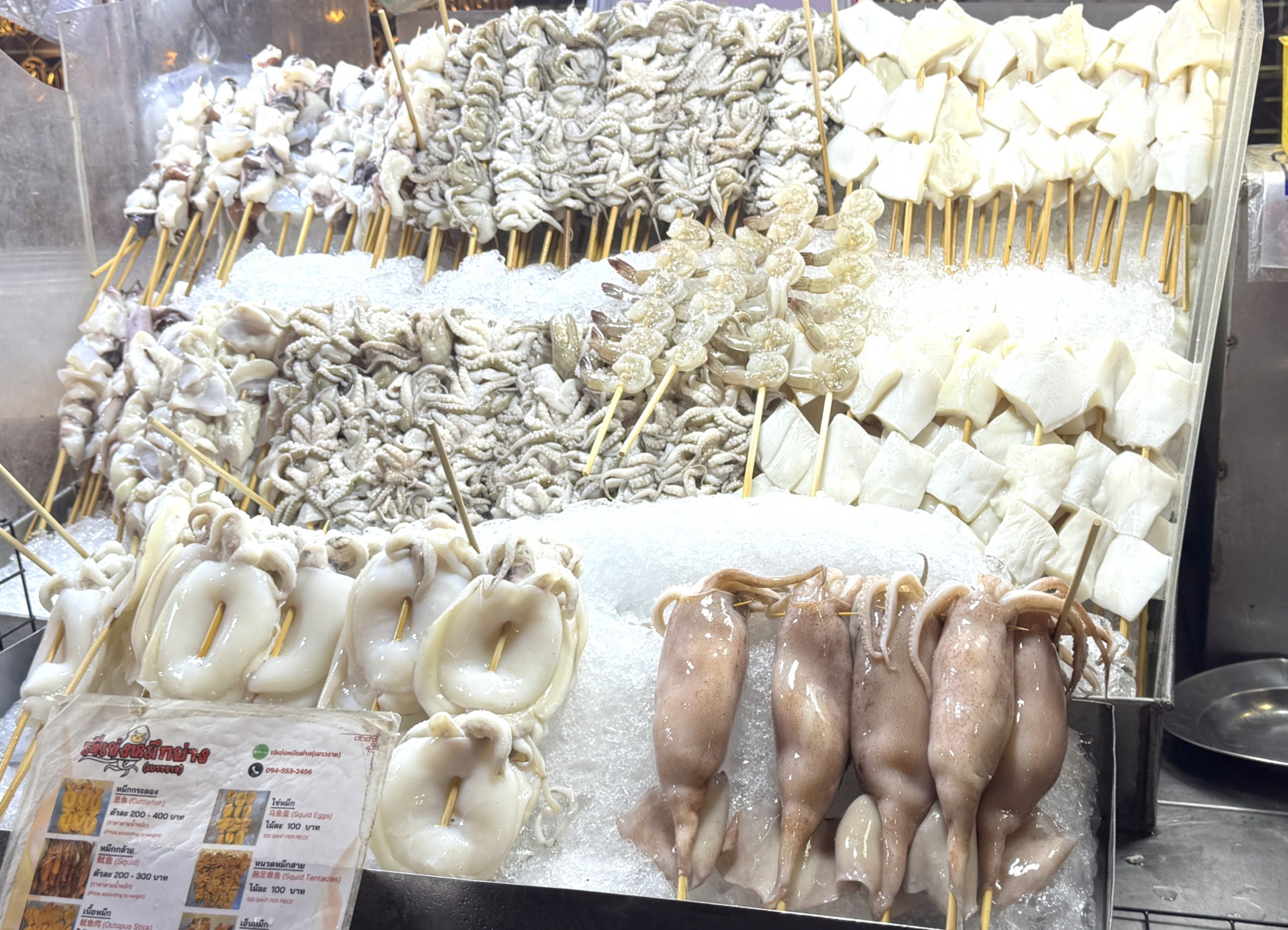 Around the corner from the Golden Mount is ‘Elvis Suki’, our first food stop. It’s a small, non-descript restaurant which has repeatedly won a Michelin “Bib Gourmond” award. Their specialty is sukiyaki – the Thai version, not Japanese. I had the seafood suki, Mary went with chicken. First time eating squid tentacles with chopsticks for me! Delicious.