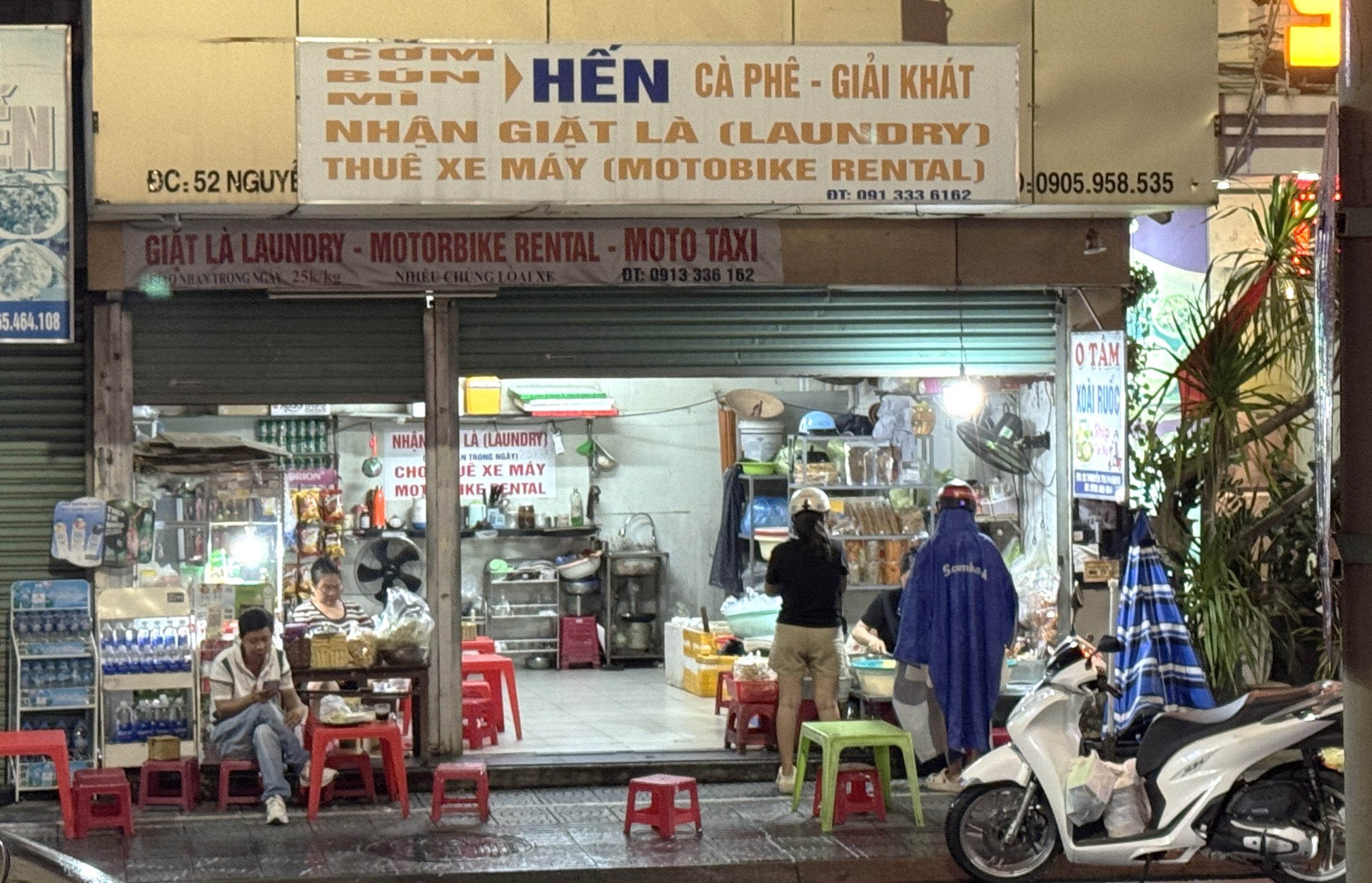 After dinner at the hotel restaurant, we stopped by their bar, ‘Beer & Barrel’, which is under cover and overlooking a main street – great for people watching. Just across the street was an interesting business advertising themselves as providing laundry, scooter rental, & taxi service in addition to a food takeaway specializing in papaya salad. Busy place!