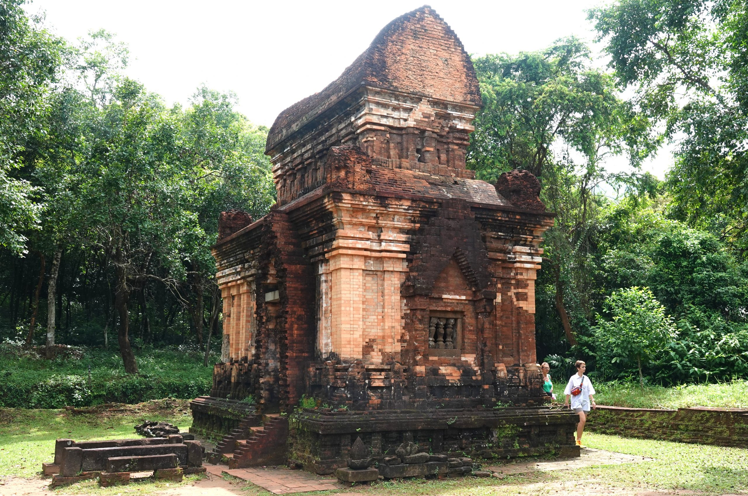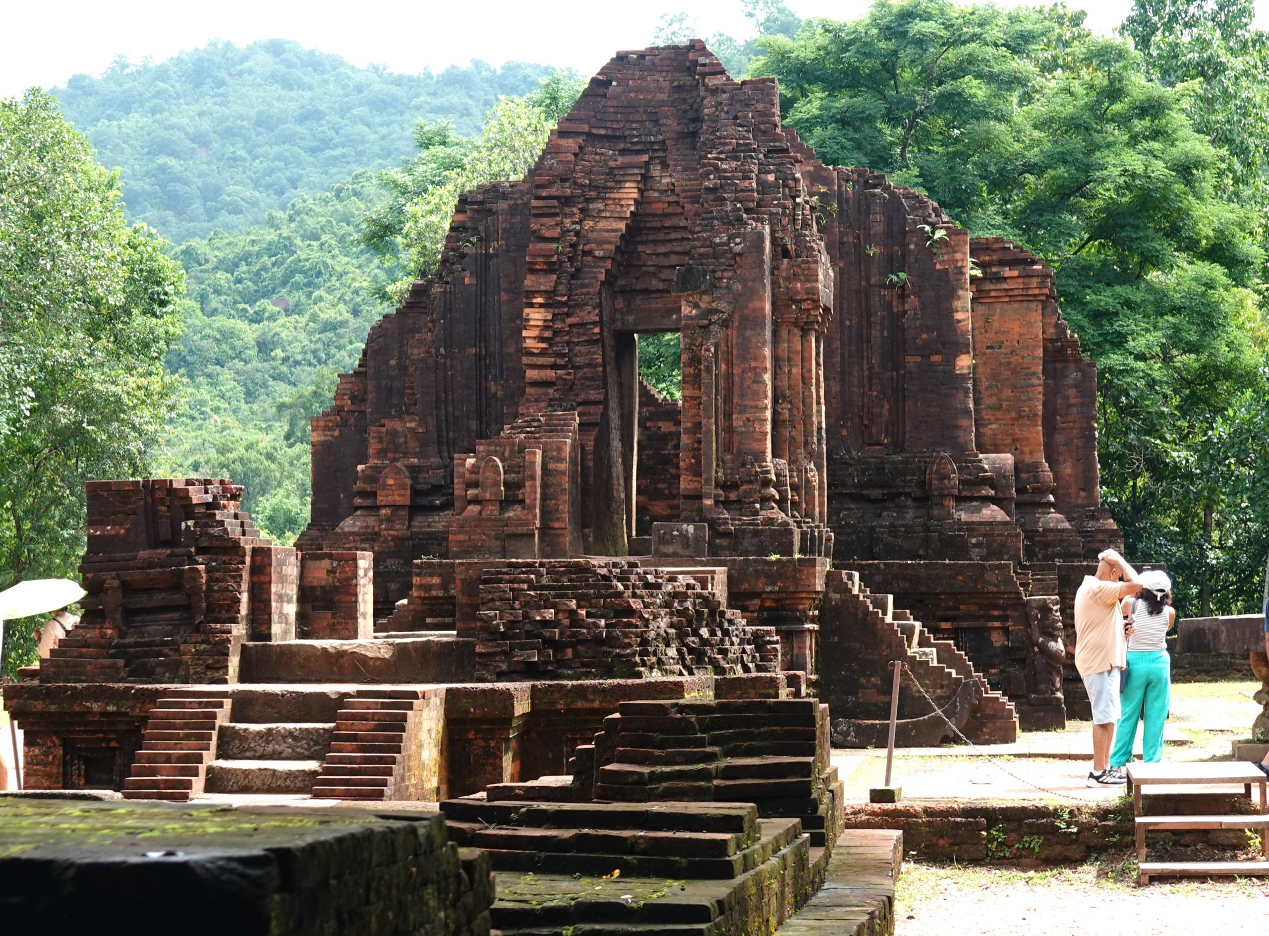 Our day started with a tour of the My Son ruins, a little over an hour drive from Hoi An. My Son was once the intellectual and religious center of the Cham civilization which ruled central & southern Vietnam for centuries. Built between the 4th and 13th centuries, the complex is perhaps the longest inhabited archaeological site in mainland Southeast Asia. The entire complex at one time contained over 70 temples. Sadly, a large majority of its architecture was destroyed first by French forces in the mid-50’s and later by US B52 bombing during a single week of the Vietnam War as the Viet Cong based their headquarters in the area. There are quite a few bomb craters still visible on the grounds and signs warn of closed-off areas where mines have not been cleared. Reconstruction is ongoing, much of which is jointly financed by the Vietnamese and Indian governments. We were lucky with our timing and were able to watch a Champa dance performance.