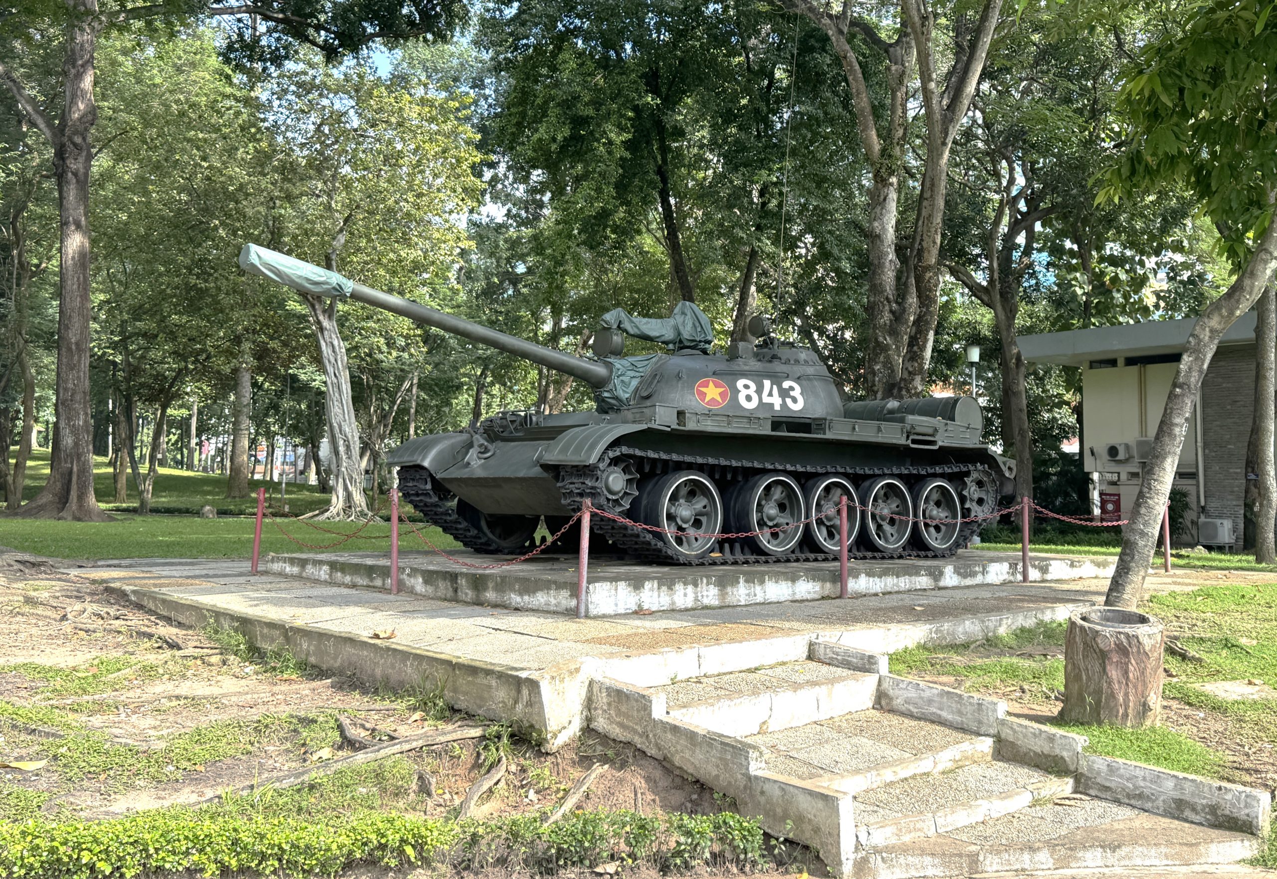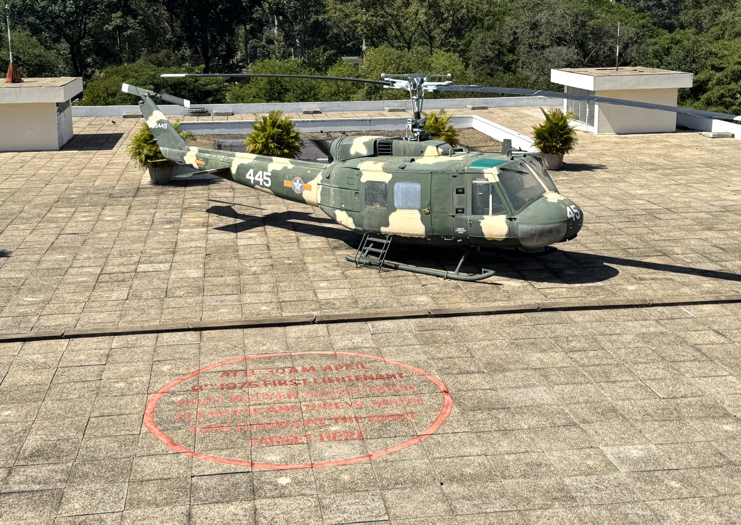 Our first stop was at the Reunification Palace, previously known the Presidential Palace. It’s a huge complex with residential zones, rooms for managing the government and war time activities, and secret escape tunnels. On the grounds were tank ‘843’ which famously crashed through the gates of the presidential palace and the helicopter used by a traitorous South Vietnamese pilot in a failed attempt to assassinate the President.