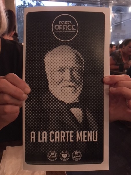 We take a quick walkabout to get the lay of the land. We are very close to Chinatown so there are a significant number of Chinese, Vietnamese and Thai restaurants in the area. We keep wandering and eventually find ‘Fathers Office’, a 1920’s prohibition era themed speakeasy and restaurant. The man’s face on the front of the menu looks slightly familiar, I overhear two waitresses talking and find out that it is Andrew Carnegie, how funny. The name of the restaurant is a tongue-in-cheek reference to Mr. Carnegie, a known teetotaler.