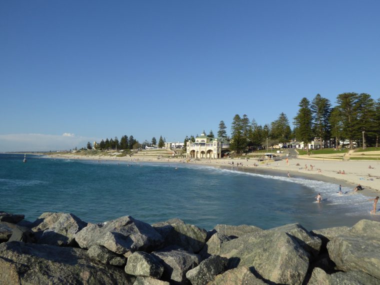 Over the last few days we asked a number of locals which beach is best for a good sunset view. The answer is always the same – Cottesloe Beach. Four stops on the light rail system and $3 AUS each and we’re there. It’s a beautiful beach with nice walkways, park areas for the ‘yout’ and really fantastic sand. It’s surprising how cold the water is, but this is early spring in the Southern Hemisphere and the Indian Ocean takes a while to warm up. I was hoping to see a ‘shark warning’ sign as yesterday the beach was closed due to a great white being spotted off shore. Alas, things are safe again so no photo op.
