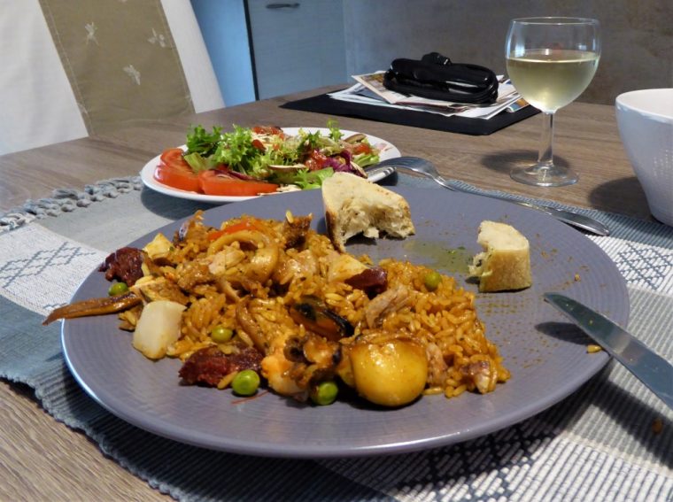 Dinner at home, with a nice side salad with fresh dressing prepared by Chef Richard and the Paella from the market.