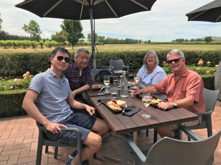 About a 40-minute drive from Christchurch is the Waipara wine region. Since we do not have a car we have booked a half day wine tour with lunch through Canterbury Leisure Tours. We are scheduled for a 12:30 pickup from the cottage. The driver (Graham) arrives in a small passenger van and says we just need to pick up two more people, good – we like small groups. We pick up Alex and his father ‘Fred’, who are visiting from Hong Kong and head out. We are supposed to visit four wineries with a small lunch stop at one of them. Graham informs us that we will be visiting four, but will not have a tasting at the first one, just lunch – his reason is that it is ‘silly season’, with the really large tour groups (think buses) overwhelming the tasting rooms. Hmmm.