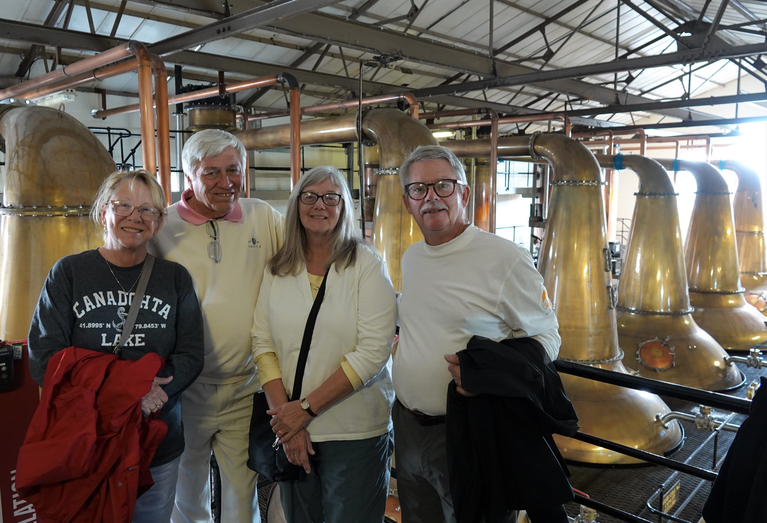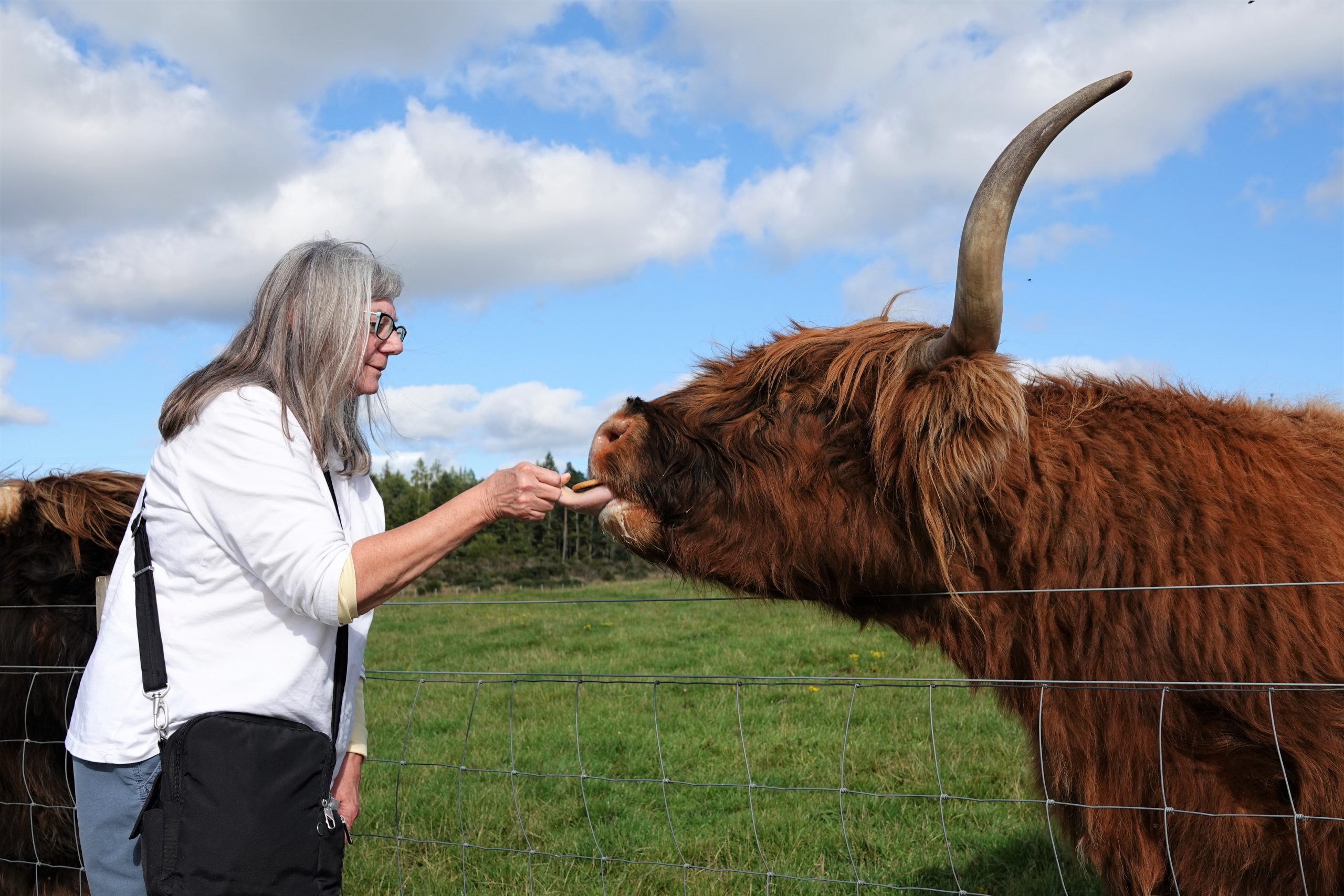 We enjoyed a nice lunch at the Mash Tun Inn in Aberlour along with a wee dram. Compulsory in this part of the region. Excellent food, very excellent dram. Onward to the Cardhu Distillery just down the road for a tour and tasting. Cardhu’s main output is a base for the Johnny Walker line but they also do a range of single malts. Cardhu’s grounds are large and there is a herd of Hairy Coos in residence. George has brought along some ‘digestives’ as he calls them which must be a favorite as the beasts come running. Good fun.