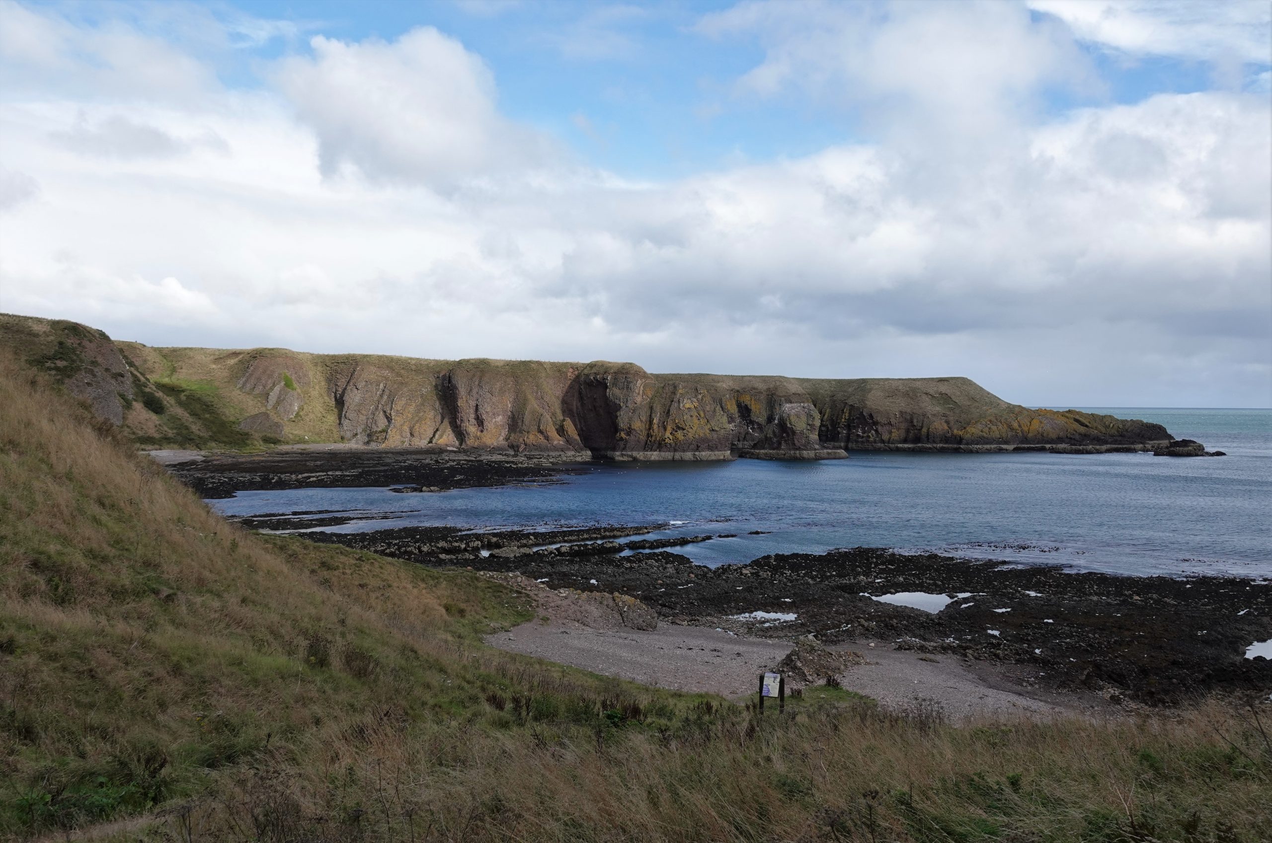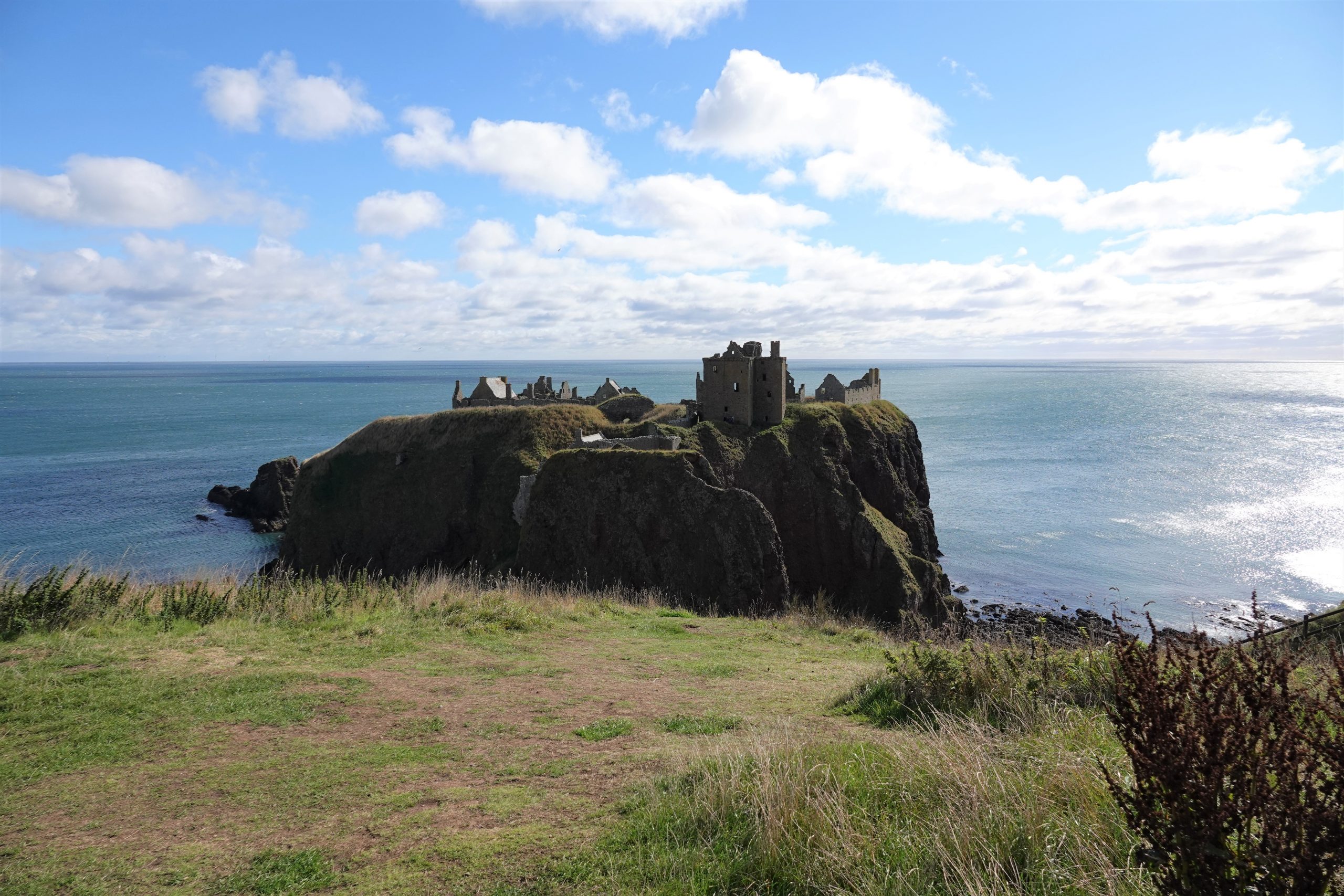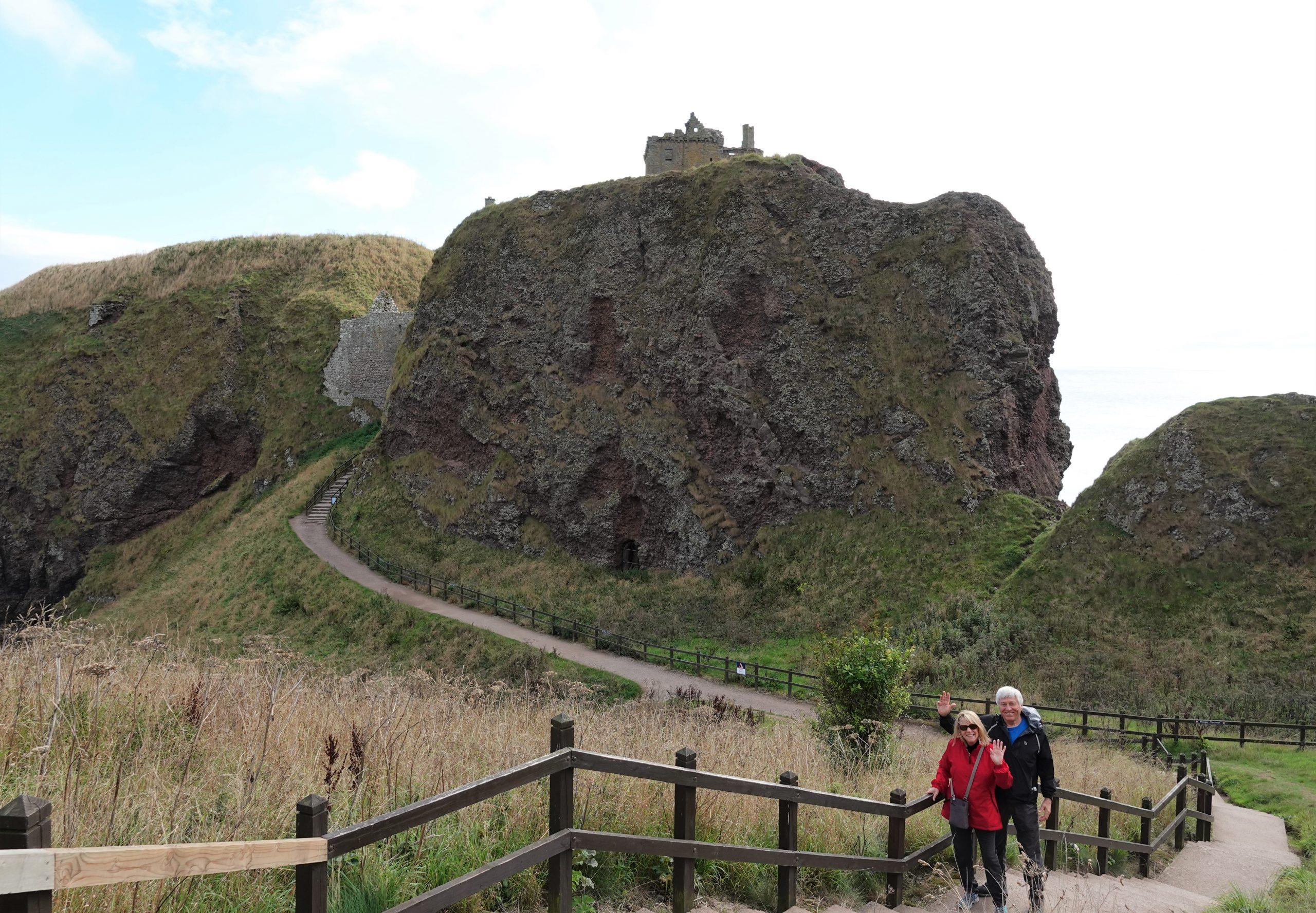 Dunnottar Castle is a 45-minute walk along the Aberdeenshire Coastal Trail from Stonehaven. Don and Joyce head out for the castle. Mary & I head to the town for a cash run (two machines out of order, 3rd time’s a charm!) then head for the trail. It’s an uphill track that proceeds along the windy coastline on a small path. Blue skies and spectacular views, along with a fierce wind off the waters. About halfway there we meet up with a gentleman who was biking along the trail. Turns out he is 83 years old, and he bikes to and from the castle every day.