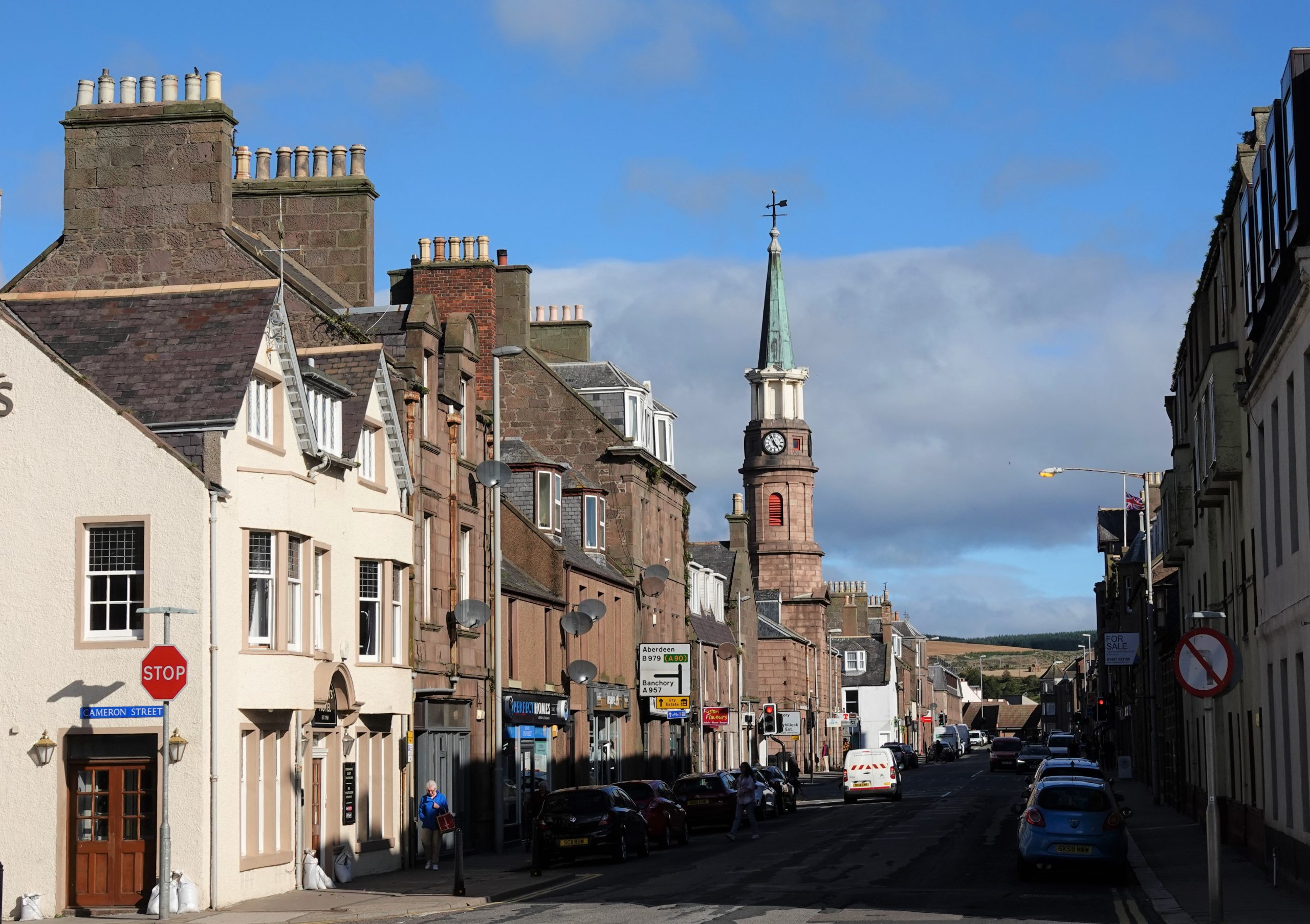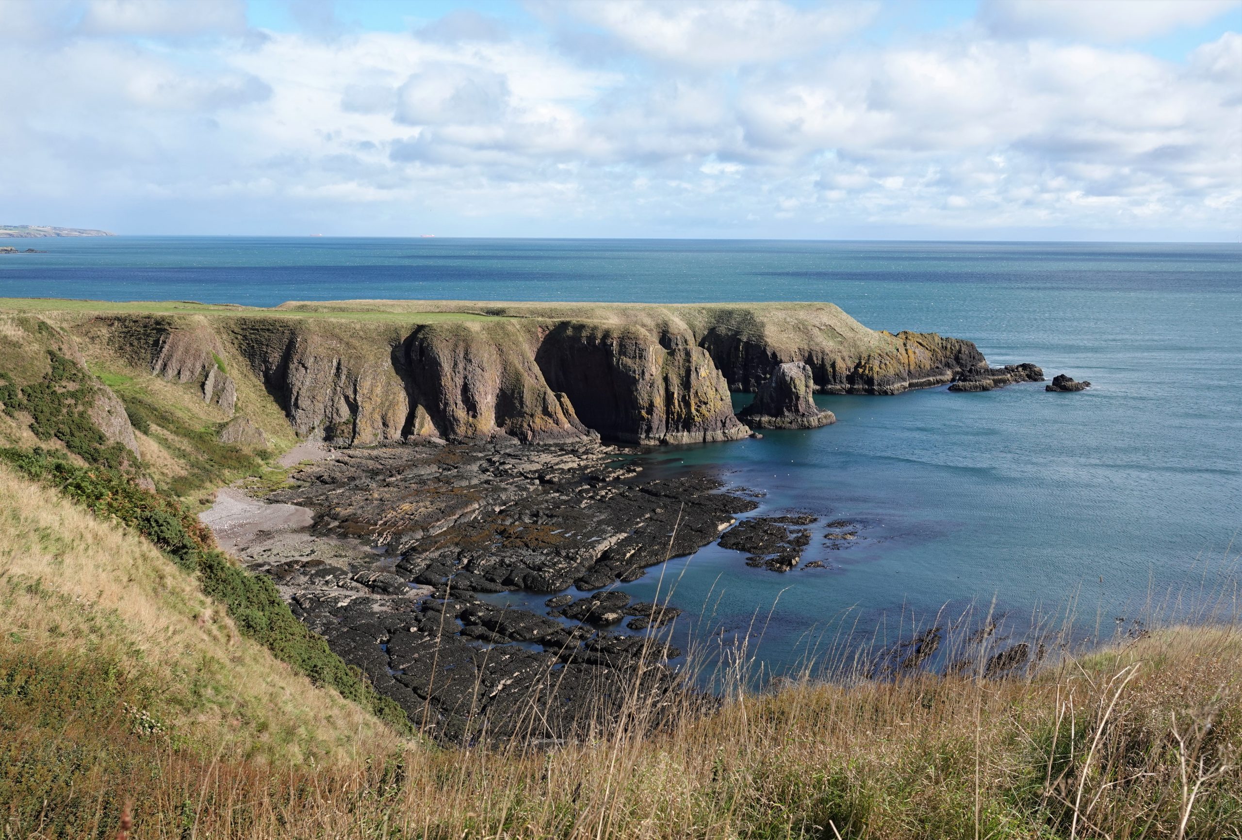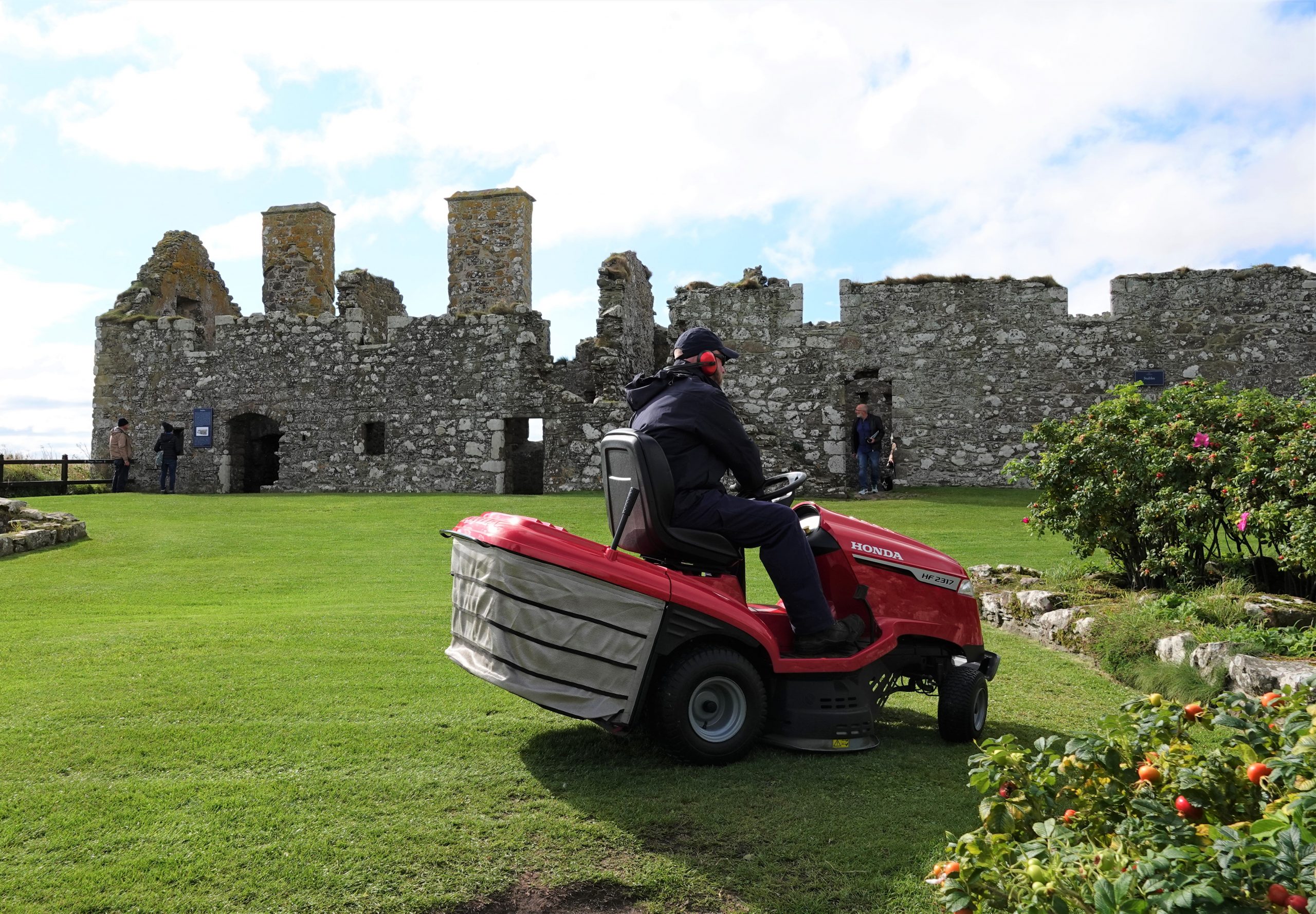 Dunnottar Castle is a 45-minute walk along the Aberdeenshire Coastal Trail from Stonehaven. Don and Joyce head out for the castle. Mary & I head to the town for a cash run (two machines out of order, 3rd time’s a charm!) then head for the trail. It’s an uphill track that proceeds along the windy coastline on a small path. Blue skies and spectacular views, along with a fierce wind off the waters. About halfway there we meet up with a gentleman who was biking along the trail. Turns out he is 83 years old, and he bikes to and from the castle every day.