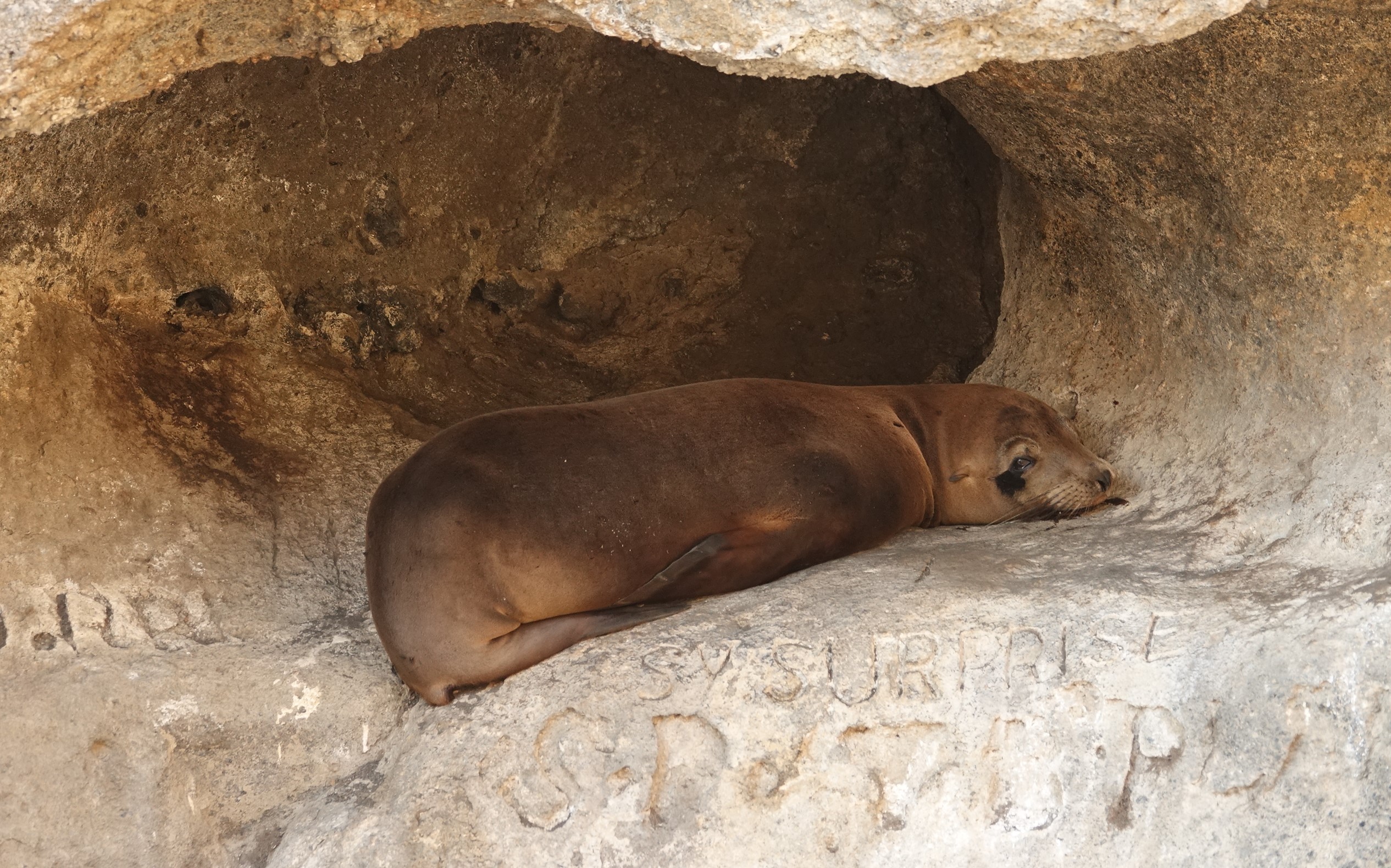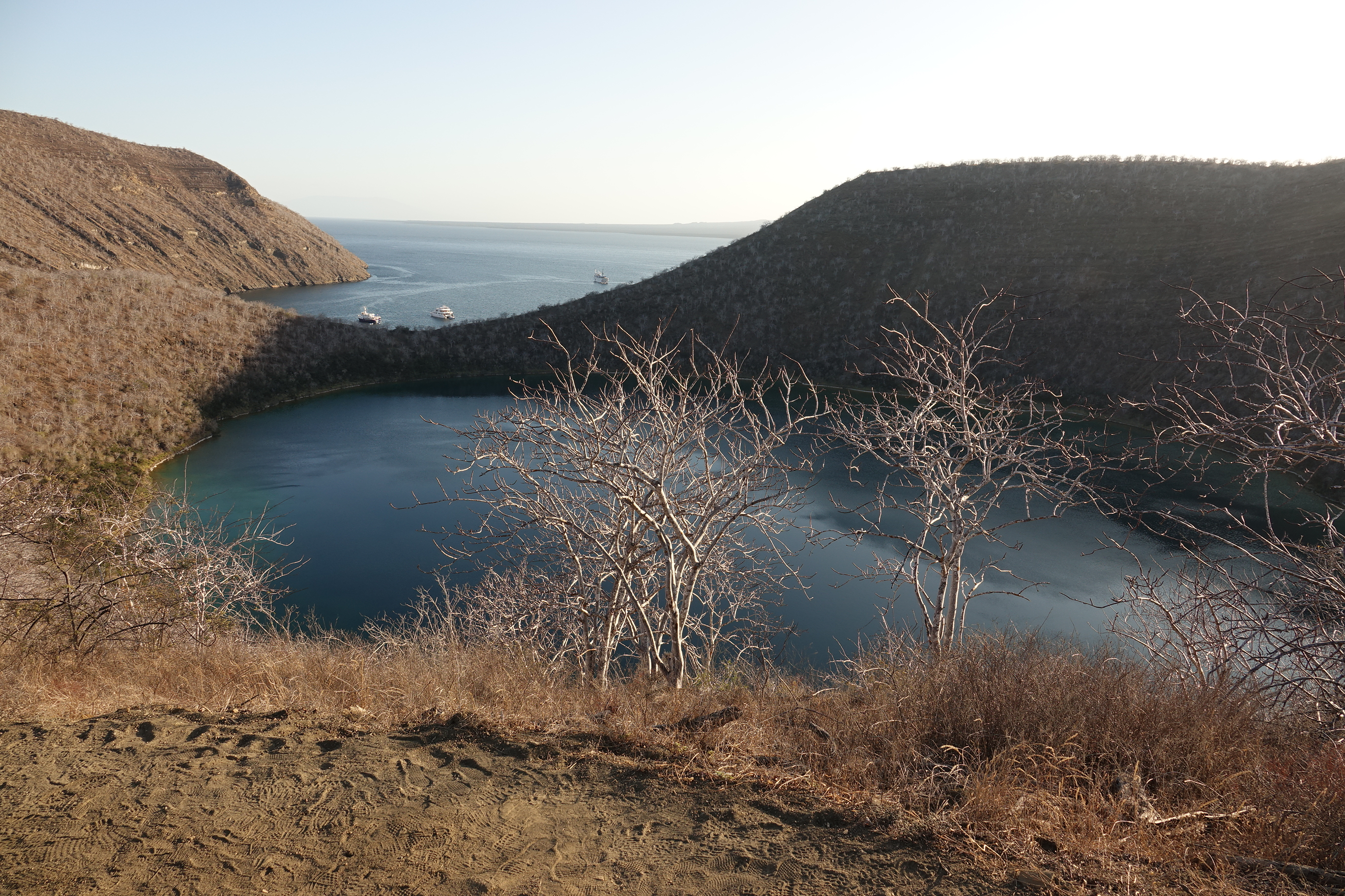 In the afternoon, we head to Tagus Cove, also on Isabella.  First up for some is a kayak excursion along the coast.  Beautiful coastline and water with turtles and tons of waterbirds.  A couple of the guys came across penguins, but not me, alas.  Later in the afternoon we took a panga from ship & walked steep paths to top of trail with great views of Darwin Lake & Ocean.  Along the way graffiti viewed with names & dates of older ship visits, including pirates.  Oldest was 1836.   Very cool!