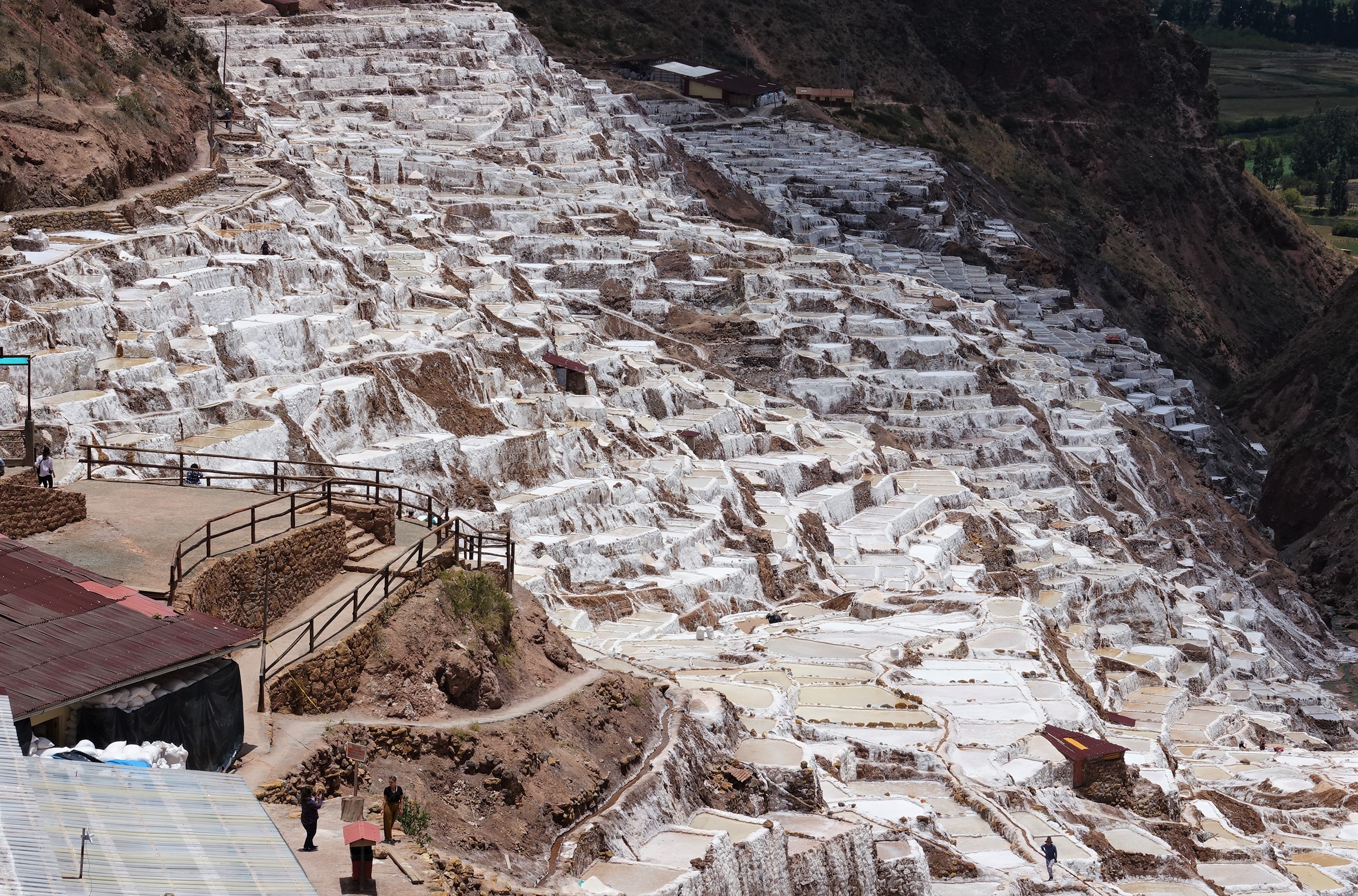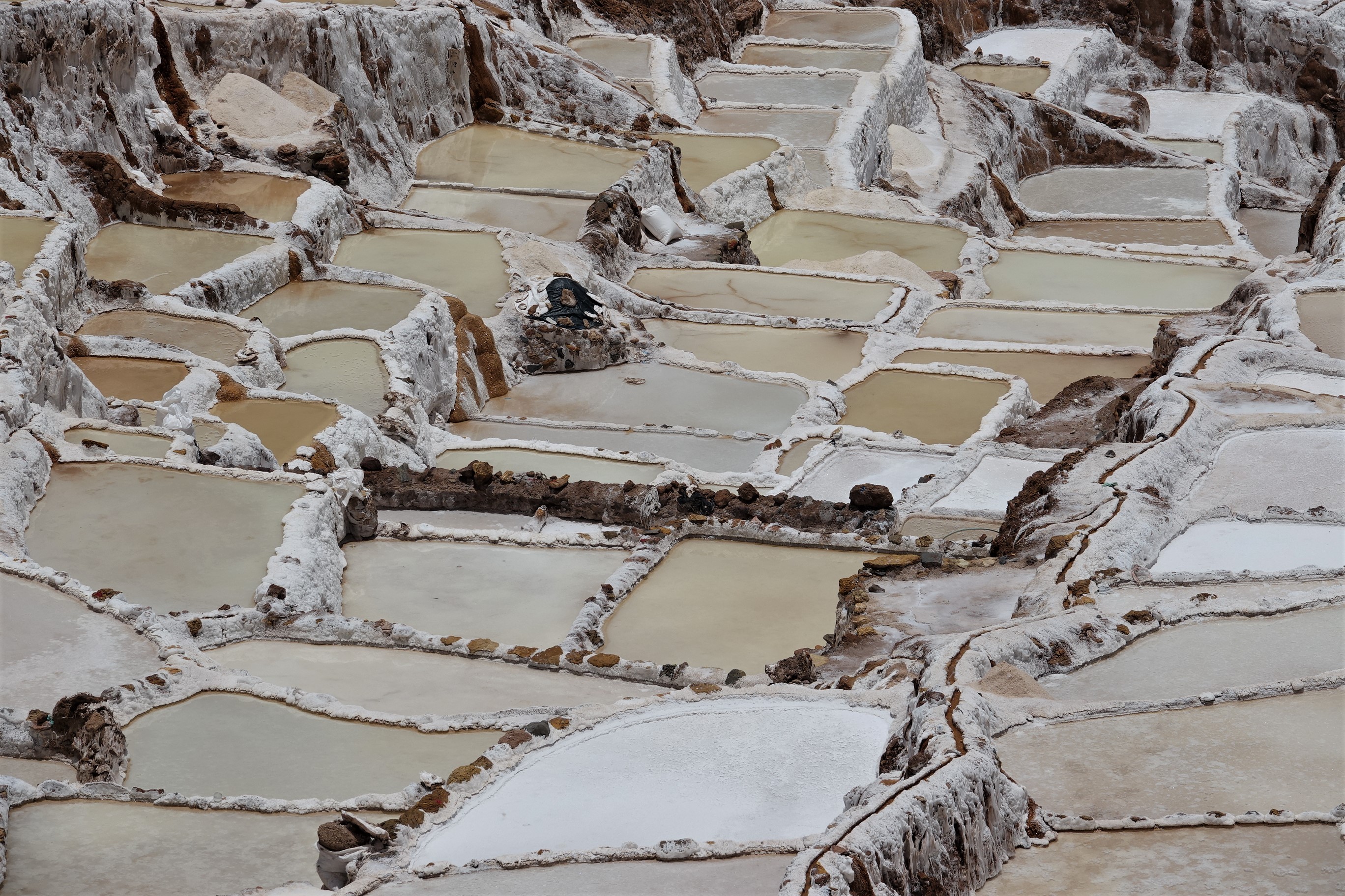 A short drive from Ollantaytambo are the ‘Salinas de Maras’ or Salt Pans of Maras. A natural spring feeds a salt-rich stream through a patchwork of some 4000 shallow pools (pans) where the water is allowed to evaporate, and salt crystals scraped from the ground with simple instruments. Pans have been ‘owned’ by individual families for generations (over 1000 years pre-Incan). Packaging and sales are handled by a village cooperative. We observed an ageless process of production.