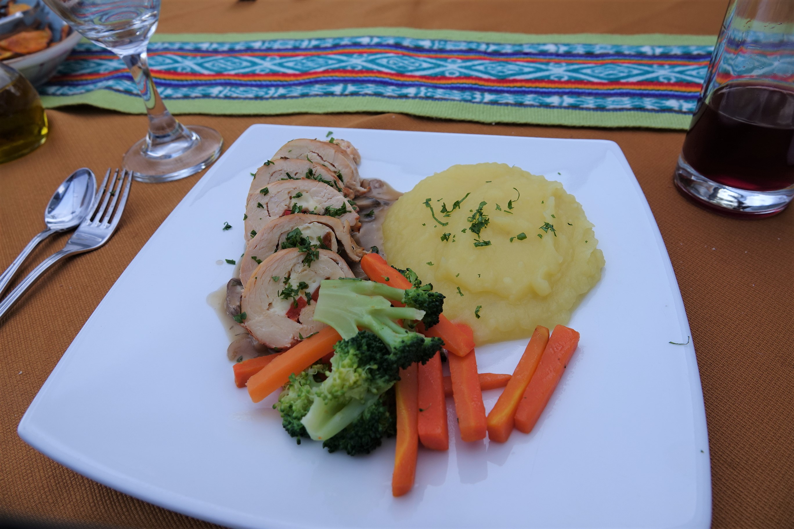 Rubin has arranged for a ‘picnic’ lunch. Set in a tent overlooking the Andes mountains, a local chef has set up a temporary kitchen to prepare our food. We start with some fresh bread and marinated olives accompanied by Chincha beer or a Sauvignon Blanc. Next, we have an amazing rainbow trout ceviche. The entrée consists of a chicken breast pounded and rolled with a filling accompanied by rice and fresh vegetables. A dessert follows. Not what I normally think of when I think picnic lunch.