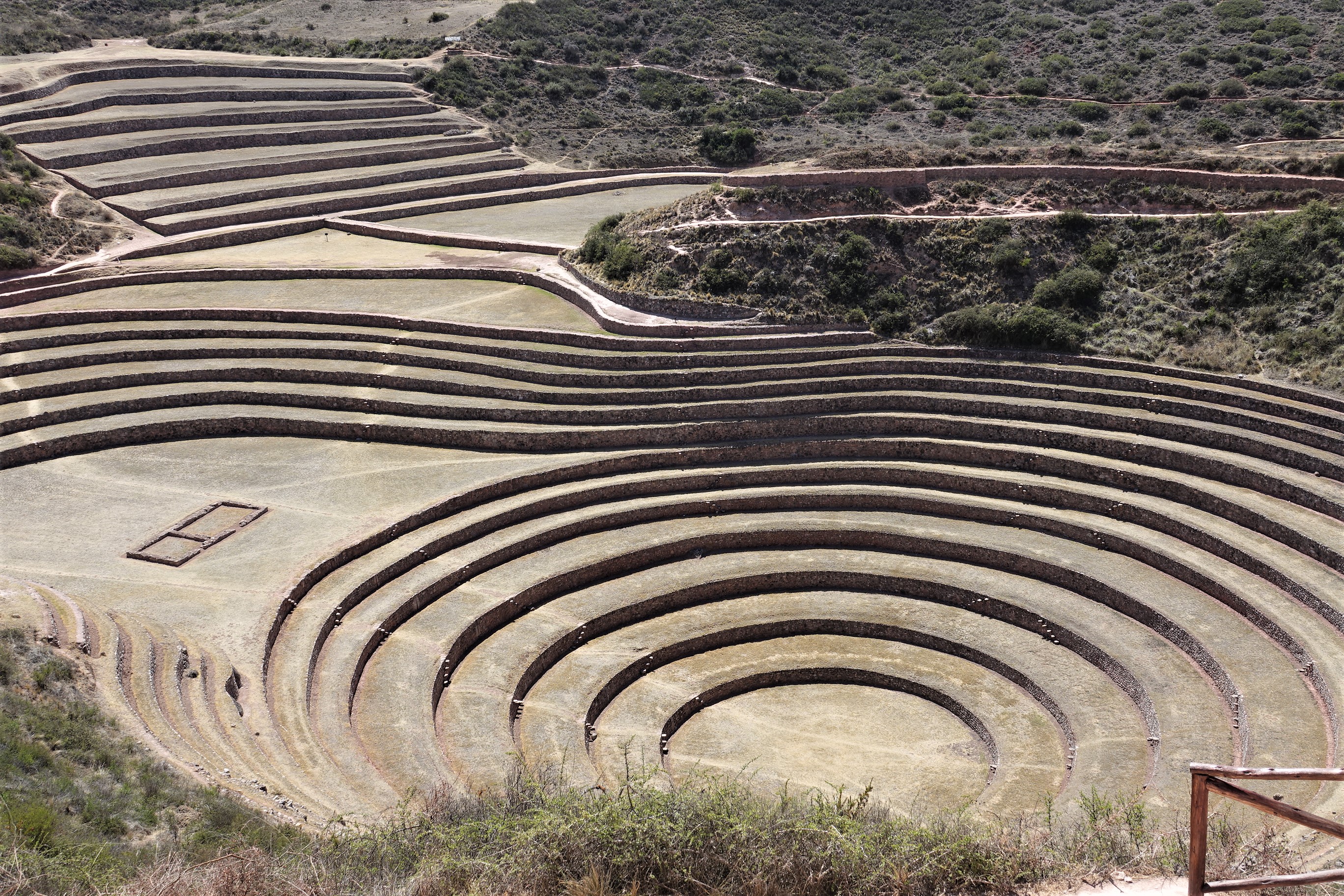 Next, we go to the unique Incan site of Moray, with its enormous iconic circular depressions, believed to have been an Incan agricultural center. It is believed to have been used to develop microclimate versions of plants that were transported from elsewhere for adaptation to the general Inca environment.