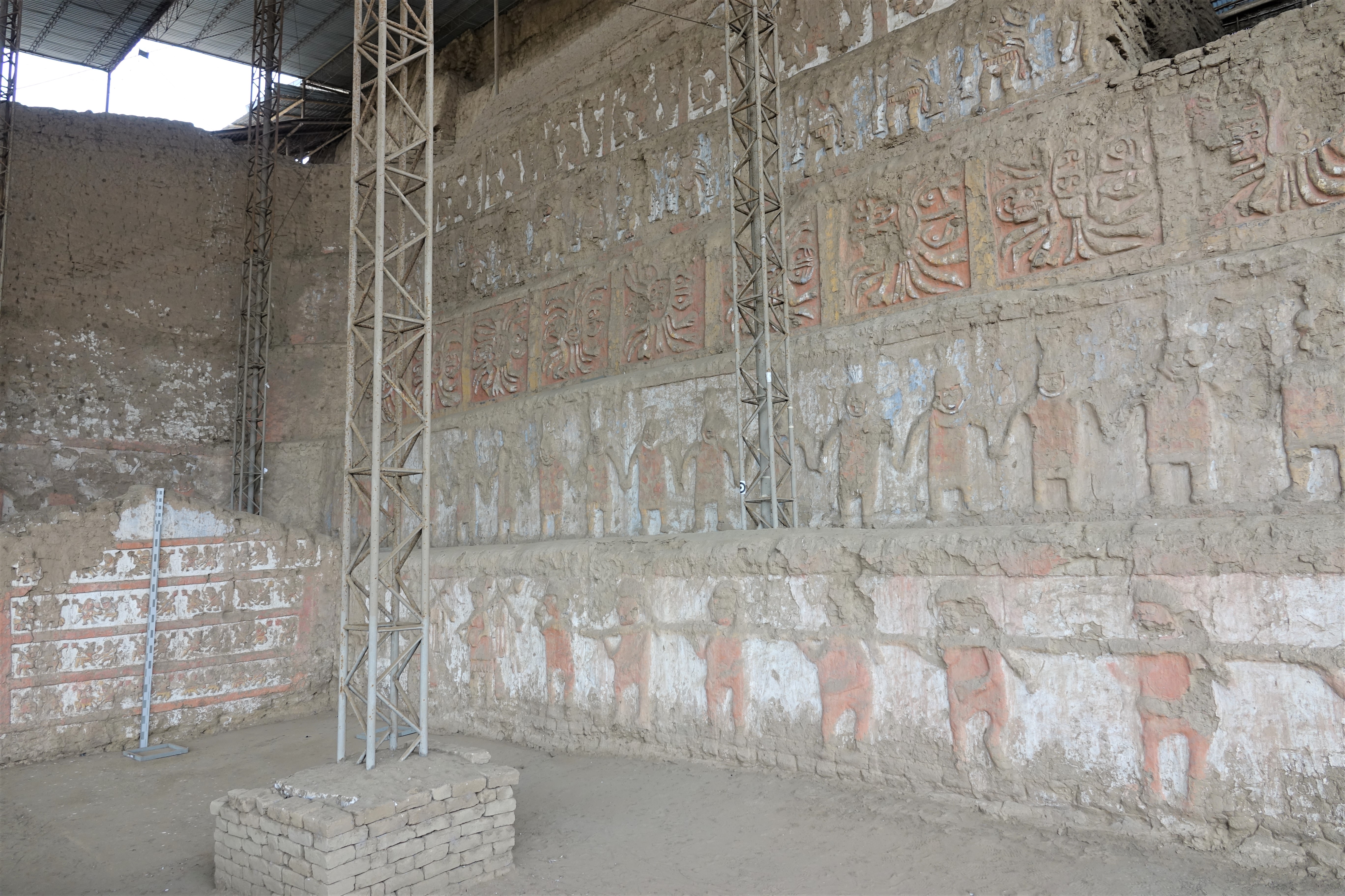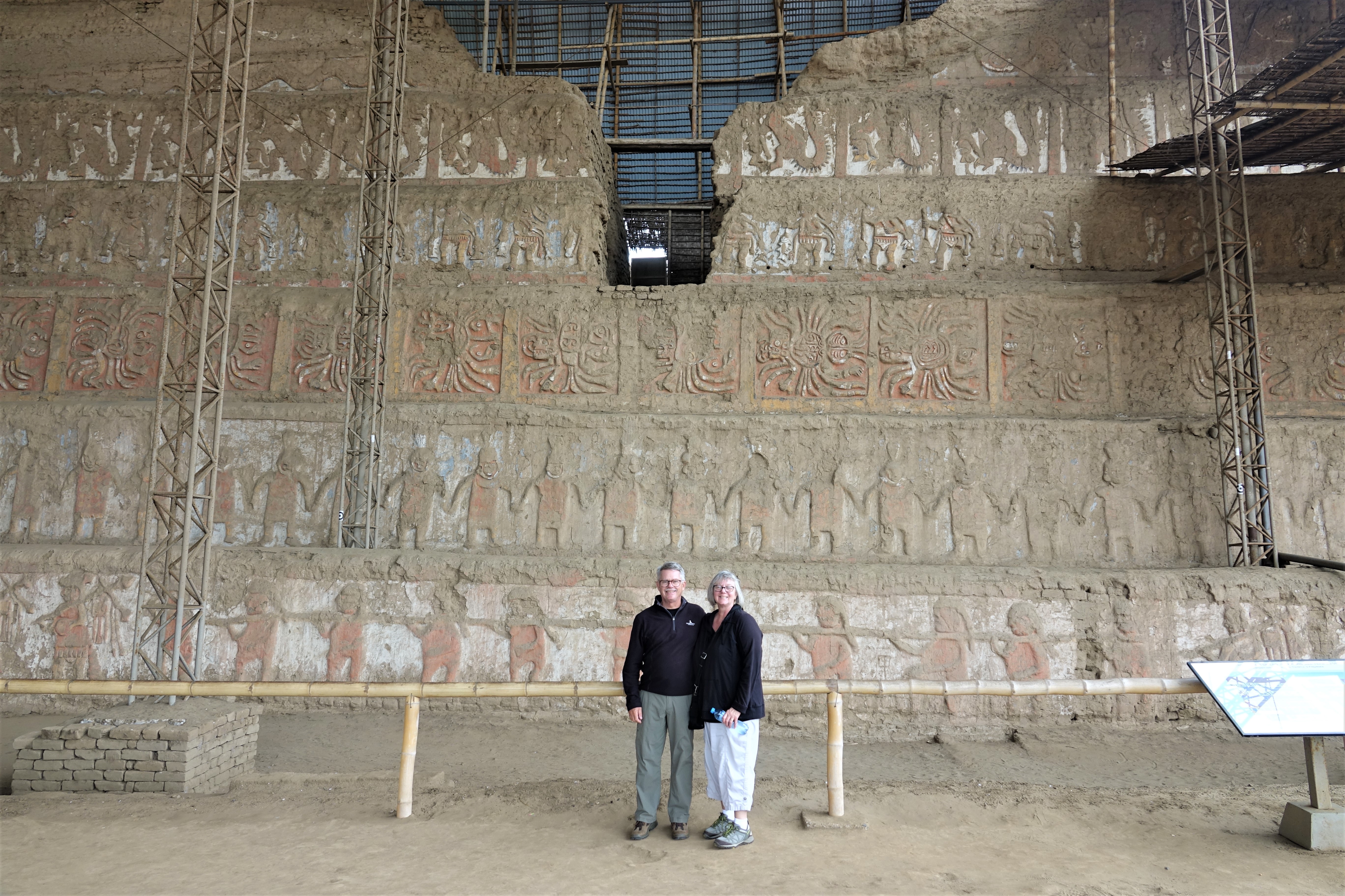 After only 3 hours of sleep in 30, we finally arrive in Trujillo to start our exploration of the ancient civilizations that Peru was home to.  Our first outing is the home of the Moche people for over 8 centuries, the ruin complex ‘Huacas del Sol y de la Luna’ (Temples of the Sun & Moon).  Discovered relatively recently, the two complexes house both the administrative and spiritual life of the Moche people.  The Temple of the Sun is the larger of the two, but the least excavated and we are unable to go inside the ruin.  The Temple of the Moon was the spiritual area and has been excavated pretty extensively from 1991 through 2017 when funding ran out.  Over the 800 years that the Moche people lived here, they remodeled the Temple of the Moon 5 times, each time building over the existing footprint and enlarging the space. There are 5 complete levels of the complex and each is visible at various areas. The complex also host an excellent museum, the ‘Huacas de Moche Museum’ which incudes an exceptional ceramics/pottery collection, artifacts from various tombs and weapons.  Our guide, Rocio, is a font of information as she has trained as an archeologist and knows this area and the ruins well.